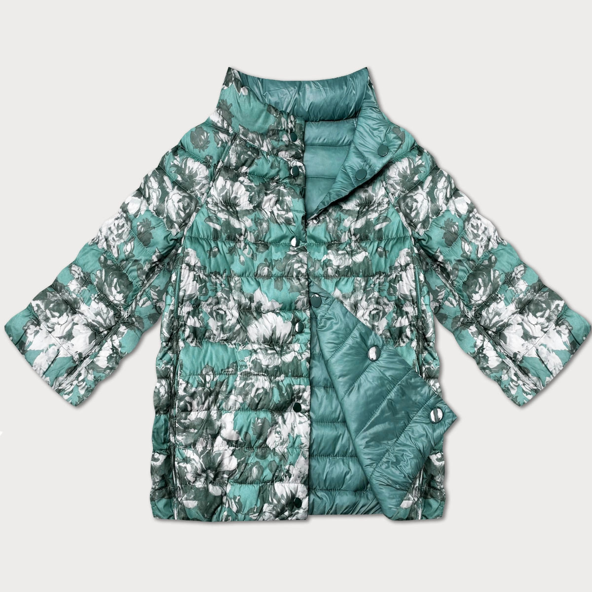 Domů Oblečení a móda Dámské oblečení Dámské bundy a kabáty Tmavě mátová/květovaná oboustranná dámská bunda se 3/4 rukávy Minority (M23-7009-253) odstíny zelené XXL (44)