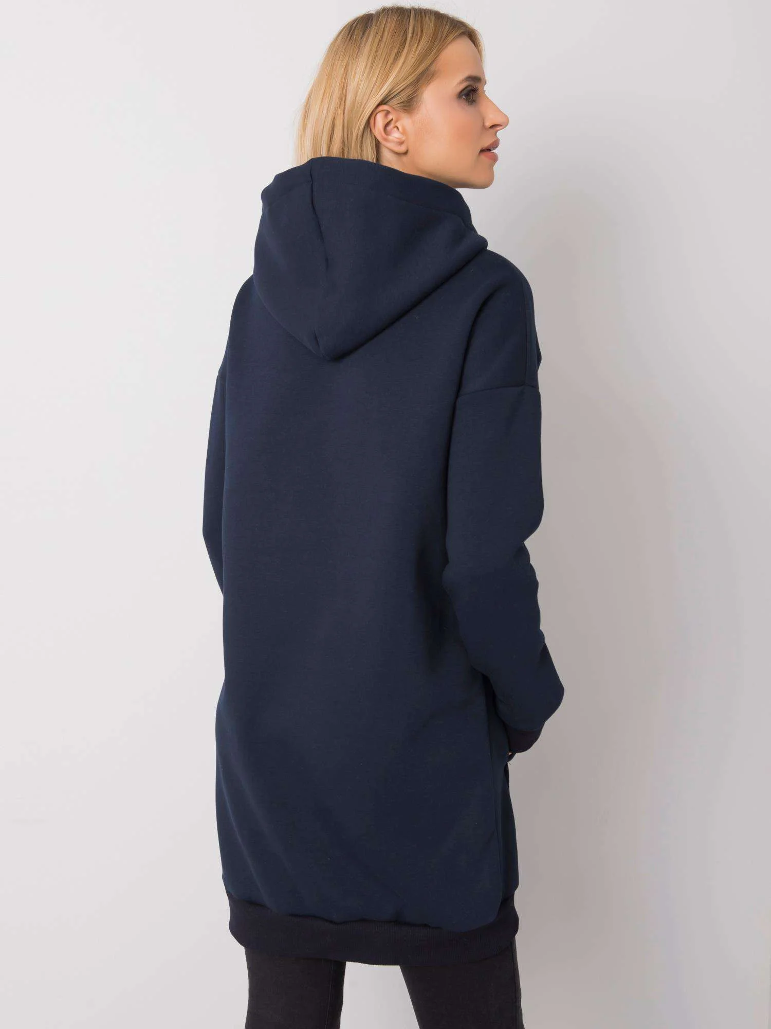 RUE PARIS Dámská tmavě modrá mikina s potiskem. složení látky: 90 % bavlna, 10 % elastan způsob praní: praní v pračce na 30 °C Modelka má na sobě velikost S/M. Rozměry modelky: výška 175 cm, prsa 84 cm, pas 65 cm, boky 92 cm. Rozměry mikiny ve velikosti S/M měřené na plocho: šířka v podpaží - 53 cm, celková délka - 83 cm, délka rukávu - 58 cmVelikost Alt.VýškaObvod hrudníku hrudníkExterní. délka. rukávVnitřní. délka rukávůS36160-164825949M38162-172866151L40164-174916353XL42166-178966555
