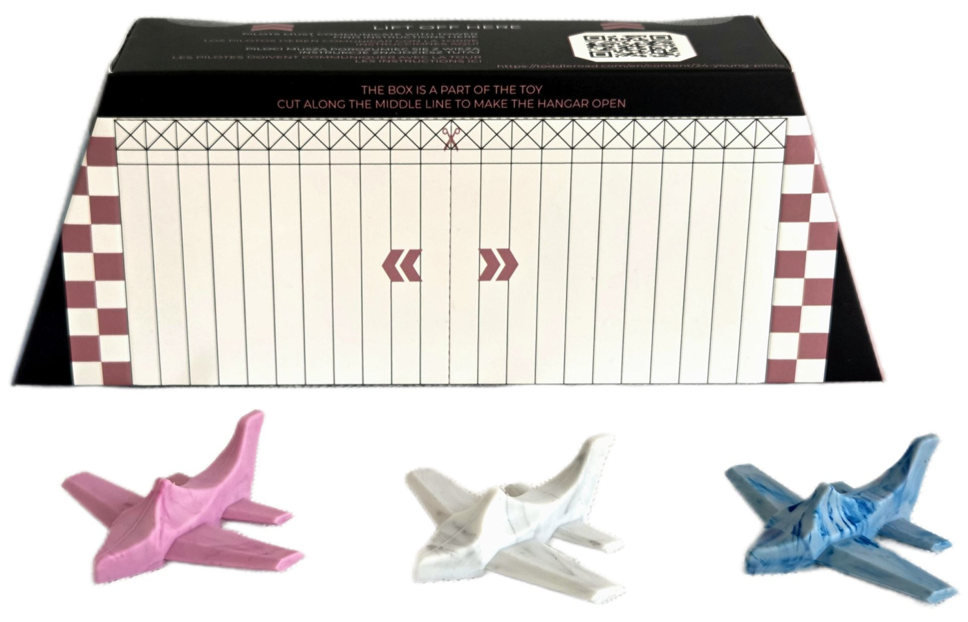 HANGÁR MARBLE slouží k rozšíření sady LETIŠTĚ. Balení obsahuje 3 silikonová ergonomicky tvarovaná letadla v pastelových barvách s mramorovým žíháním a funkční krabici hangáru s potiskem. Vhodné pro děti od 1 roku. Výrobky Toddleroad mají pozitivní ohlasy od učitelů a vývojových specialistů, kteří potvrzují jedinečný přístup a všestrannost těchto produktů doma i ve vzdělávacích zařízeních. Také byli oceněni v nejuznávanějších produktových soutěžích v Polsku a Velké Británii. NAVRŽENO PRO BATOLATA A PŘEDŠKOLÁKY Podporuje jejich rozvoj v souladu s jejich fyzickými a duševními možnostmi: • buduje soběstačnost prostřednictvím nezávislé hry, kde není možné dělat chyby • podporuje prostorovou představivost prostřednictvím předstírané hry • pomáhá trénovat obratnost, motoriku a koordinaci ruka-oko Popis a doplňující informace: • Velikost silikonových letadel – délka 6,5 cm, rozpětí křídel 8 cm, výška 2,2 cm • 3 silikonová ergonomicky tvarovaná letadla v pastelových barvách s mramorovým žíháním, funkční krabice s potiskem hangáru • Materiál: potravinářský silikon • Velmi snadná údržba silikonových dílů (lze mýt i v myčce do 50 °C) • Baleno v krabici s motivem hangáru. Krabice je součástí hračky. • Všechny sady a doplňky jsou vzájemně kompatibilní • Rozměry balení: 27 x 10 x 6,5 cm (š x d x v) • Váha balení: 0,1 kg • Vhodné pro děti od 1 roku • Vyrobeno v Číně • Navrženo v Polsku