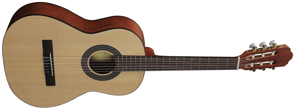 Dětská klasická kytara Toledo Estudio ST34AS je cenově dostupná dětská klasická kytara v 3/4 velikosti vhodná pro začínající hráče. Nabízí přední desku z vrstveného smrku, zadní desku a luby z vrstveného mahagonu, krk z okoumé a palisandrový hmatník a kobylku. Struny jsou uchyceny v klasických otevřených ladicích mechanikách s kolíčky z imitace perleti. Stylové zpracování podtrhuje černá obvodová lemovka doplněná černobílými linkami, dekorativní rozeta a saténový finiš (open pore satin natural).