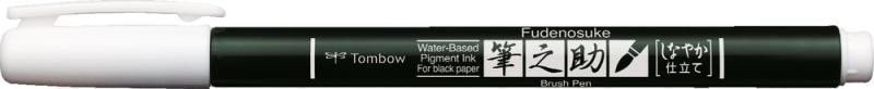 Fix Fudenosuke (brush pen) s elastickým štětcovým hrotem (typu soft) vhodný pro psaní na černý či jiný tmavý odstín papíru. „Kouzelný“ pigmentový inkoust na bázi vody: barva se objeví až pár vteřin po jejím nanesení na tmavý papír. Vrstvením inkoustu lze vytvořit intenzivnější barvy. Skvěle se hodí pro kombinování různých pomůcek, technik a materiálů, tedy mixed média. Krásně se doplňuje s pastelkami IROJITEN, fixy ABT PRO a ostatními fixy Fudenosuke. Fixy lze používat i pro psaní na bílém papíře (výsledek vypadá jinak než na tmavém papíře).Skladujte ve vodorovné poloze. Barva inkoustu: bílá.