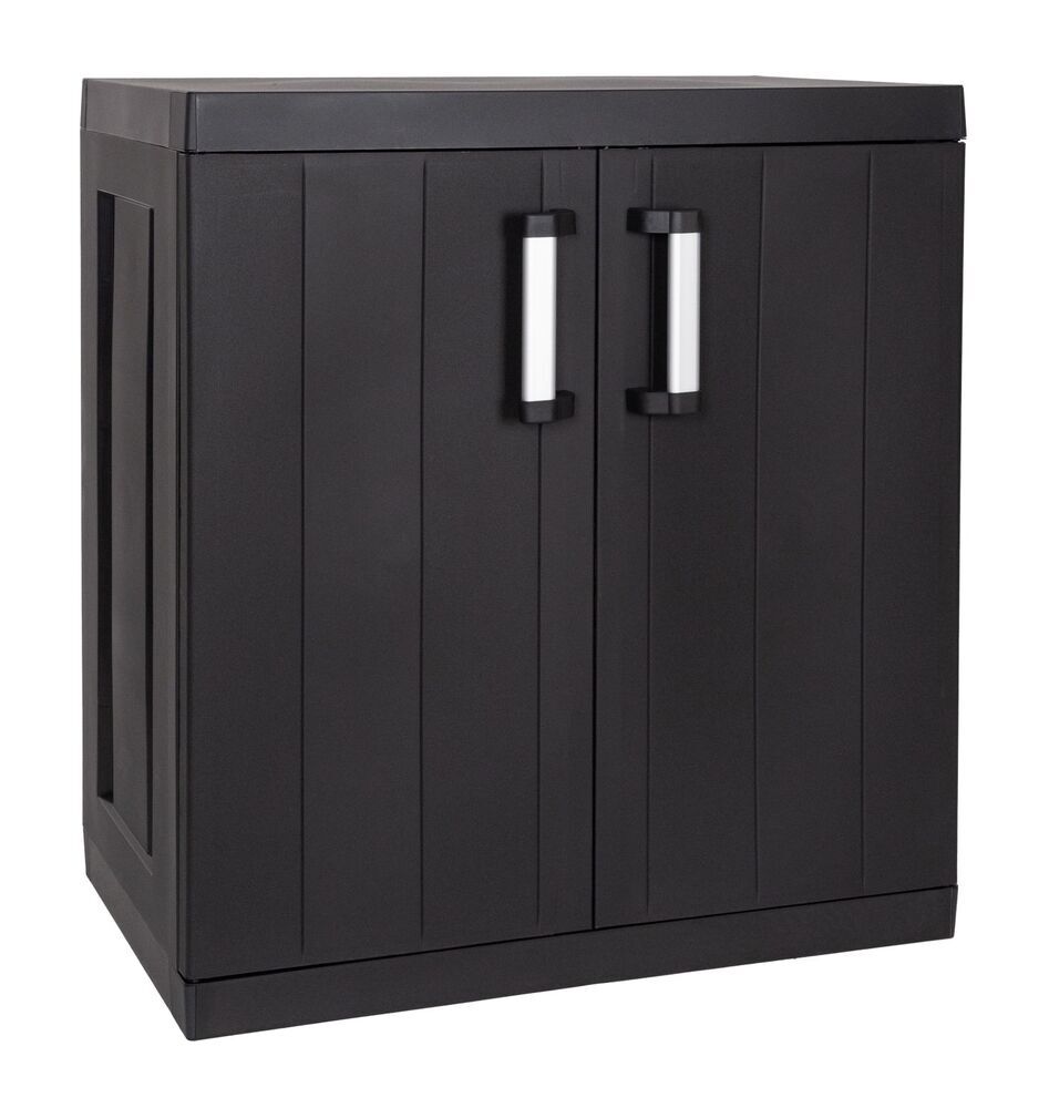 Prostorná praktická plastová dvoukřídlá skříňka GARAGE MEGA LOW v černé barvě.