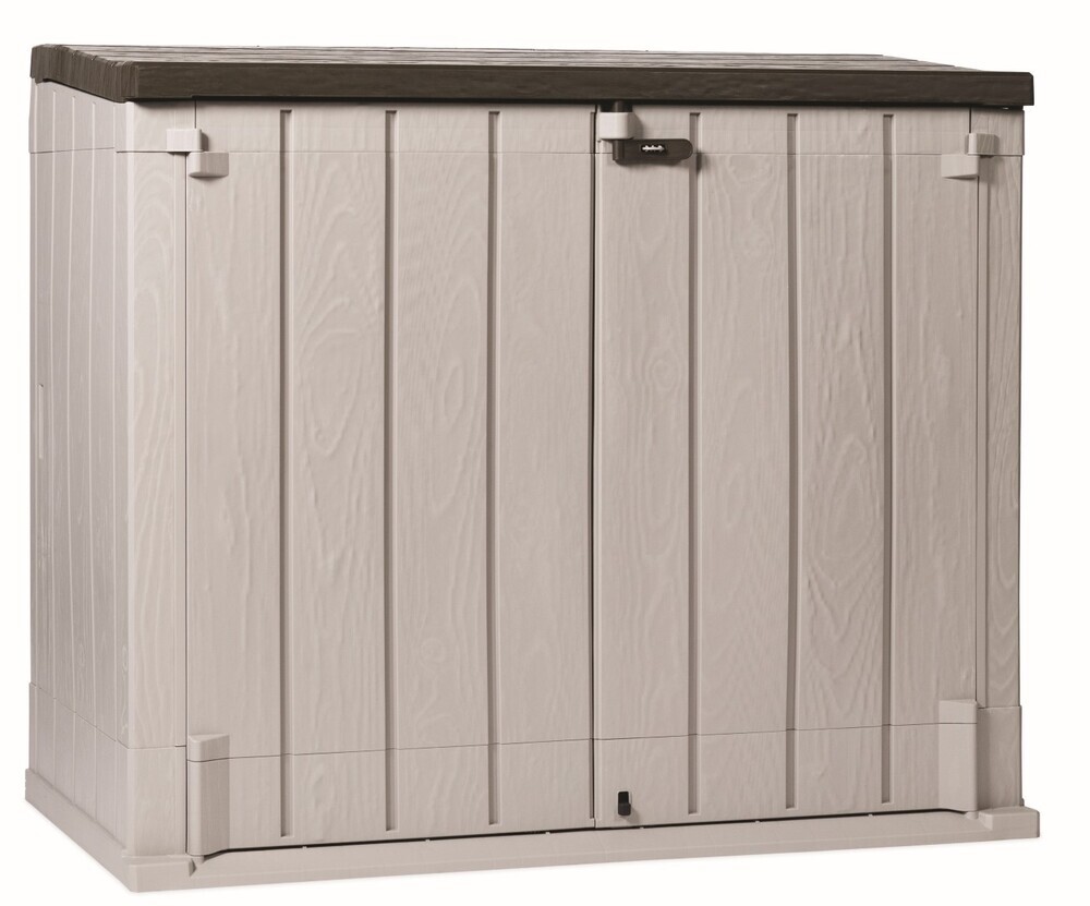 Eleganci dodává její imitace dřevěného povrchu, která je doplněna barevným provedením béžových stěn a hnědého víka, čímž se skříň stává nejen praktickým prvkem, ale také stylovým doplňkem Vaší zahrady.