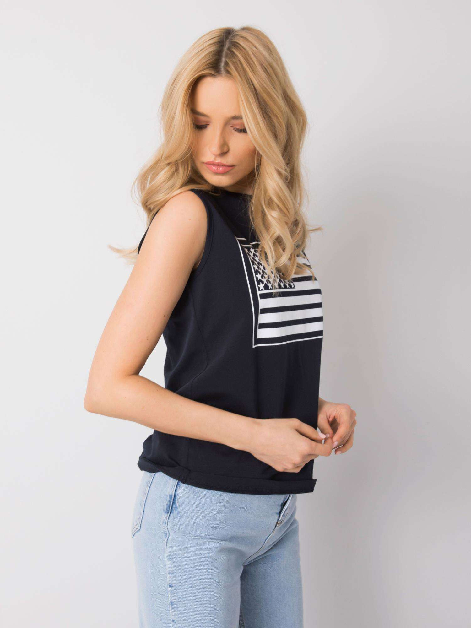 RUE PARIS Námořnicky modrý top s potiskem. složení látky: 95% bavlna, 5% elastan způsob praní: praní v pračce na 30 °C Modelka má na sobě velikost S. Rozměry modelky: výška 175 cm, prsa 84 cm, pas 65 cm, boky 92 cm. Rozměry topu ve velikosti S měřené na plocho: šířka pod průramky - 47 cm, celková délka - 59 cm