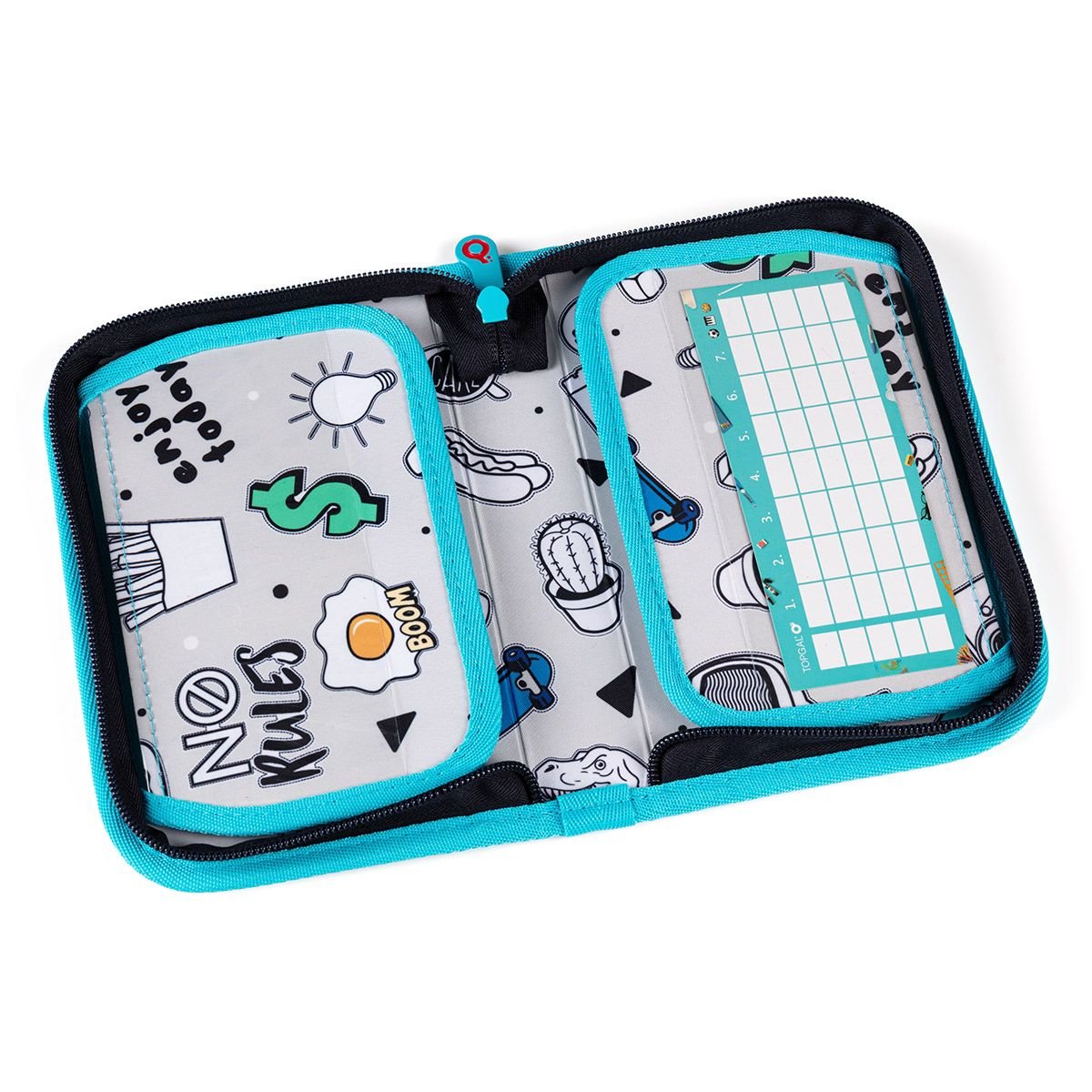 Jednopatrové školní pouzdro se dvěma klopami. Díky gumovým úchytům se do nich vejde celkem dvacetjedna pastelek, tužek a fixek. Tři širší úchyty poslouží na pravítko, kružítko či nůžky. Dva větší na gumu a ořezávátko. Penál je polstrovaný, takže spolehlivě ochrání všechny psací potřeby. Zapínání je řešeno kvalitními zipy s velkými taháčky. Ty umožňují dětem snadnější manipulaci. Pod klopou z průhledné folie najdete rozvrh hodin, druhá poslouží třeba i na taháky. ???? Tělo a podšívka penálu je z recyklovaného polyesteru dle certifikace GRS. ♻️ BONUS: Kreslení povoleno! Vnitřní podšívka pouzdra je vyrobena z šedé látky s natištěnými obrázky. Ty si mohou děti vybarvit dle nálady a chuti. Naše malé doporučení - pro vybarvování budou lepší pastelky, fixy by se mohly rozpíjet. POZOR: Neperte penál v pračce! Je vyztužen papírem a ten praní rozhodně nepřežije.
