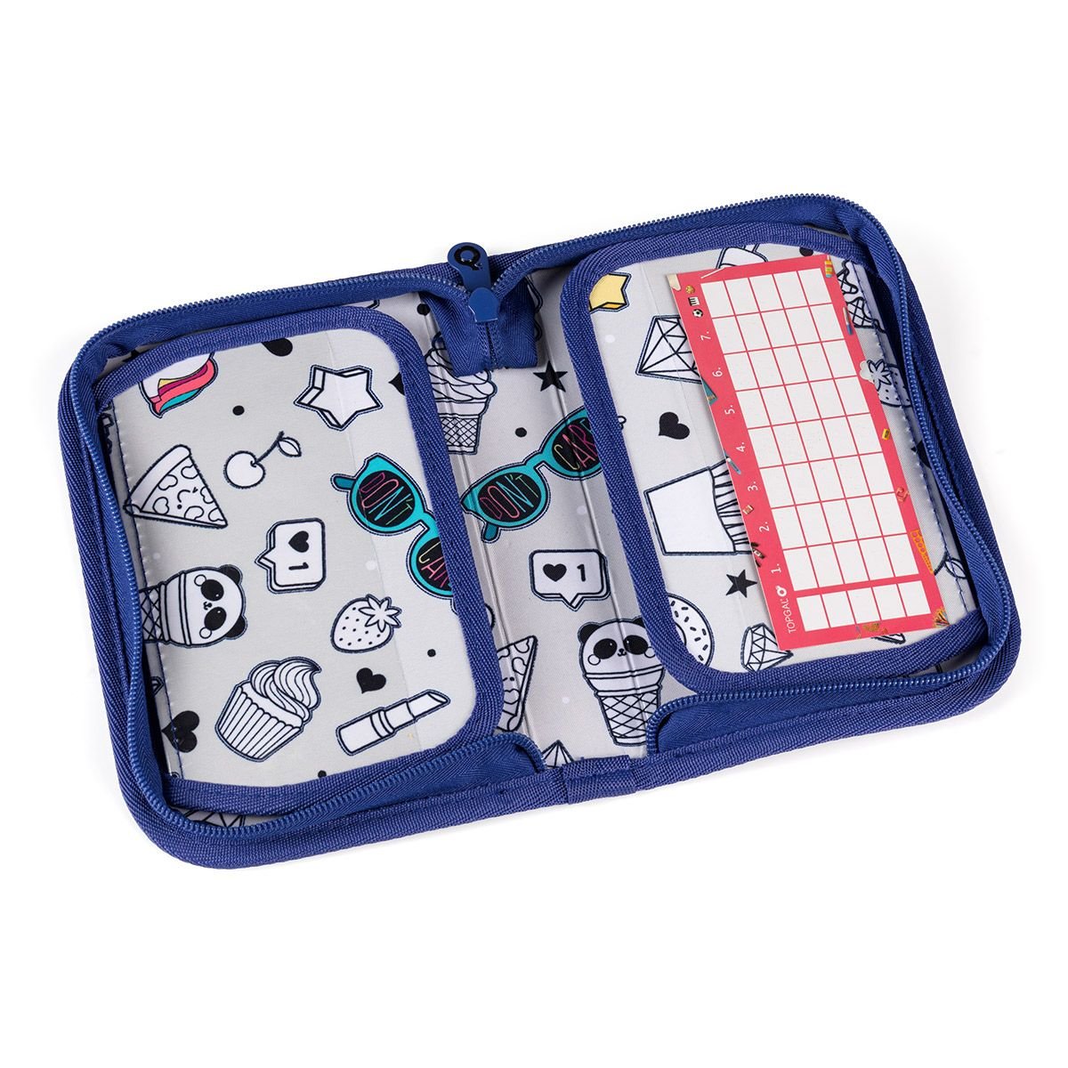 Jednopatrové školní pouzdro se dvěma klopami. Díky gumovým úchytům se do nich vejde celkem dvacetjedna pastelek, tužek a fixek. Tři širší úchyty poslouží na pravítko, kružítko či nůžky. Dva větší na gumu a ořezávátko. Penál je polstrovaný, takže spolehlivě ochrání všechny psací potřeby. Zapínání je řešeno kvalitními zipy s velkými taháčky. Ty umožňují dětem snadnější manipulaci. Pod klopou z průhledné folie najdete rozvrh hodin, druhá poslouží třeba i na taháky. ???? Tělo a podšívka penálu je z recyklovaného polyesteru dle certifikace GRS. ♻️ BONUS: Kreslení povoleno! Vnitřní podšívka pouzdra je vyrobena z šedé látky s natištěnými obrázky. Ty si mohou děti vybarvit dle nálady a chuti. Naše malé doporučení - pro vybarvování budou lepší pastelky, fixy by se mohly rozpíjet. POZOR: Neperte penál v pračce! Je vyztužen papírem a ten praní rozhodně nepřežije.