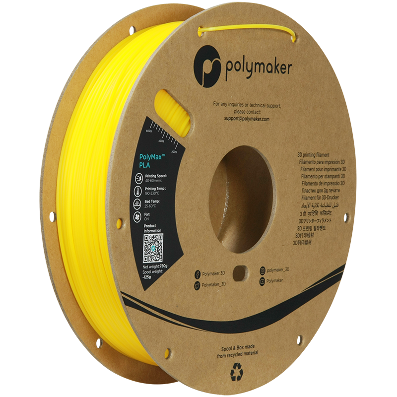 PolyMax™ je sub-brand společnosti Polymaker zaměřený na výrobu speciálních 3D tiskových vláken vyrobených pomocí technologií nanoarmingu, která dodává filamentům výjimečné mechanické vlastnosti a skvělé tiskové vlastnosti. Specifikace: Teplota trysky: 190 °C – 230 °C Teplota podložky: 25 °C – 60 °C Teplota skelného přechodu (hranice použitelnosti): 113 °C Modul pružnosti v tahu: 1879 ± 109 MPa Mez pevnosti v tahu: 28,1 ± 1,3 MPa Pevnost v ohybu: 48,0 ± 1,9 MPa Rázová houževnatost Charpy:12,2 ± 1,03 kJ/m2 Teplota skelného přechodu: 61 °C Teplota měknutí podle Vicata: 62 °C Teplota tání (melting point): 149 °C Balení: 0,75 kg Šířka struny: 1,75 mm Barva: žlutá