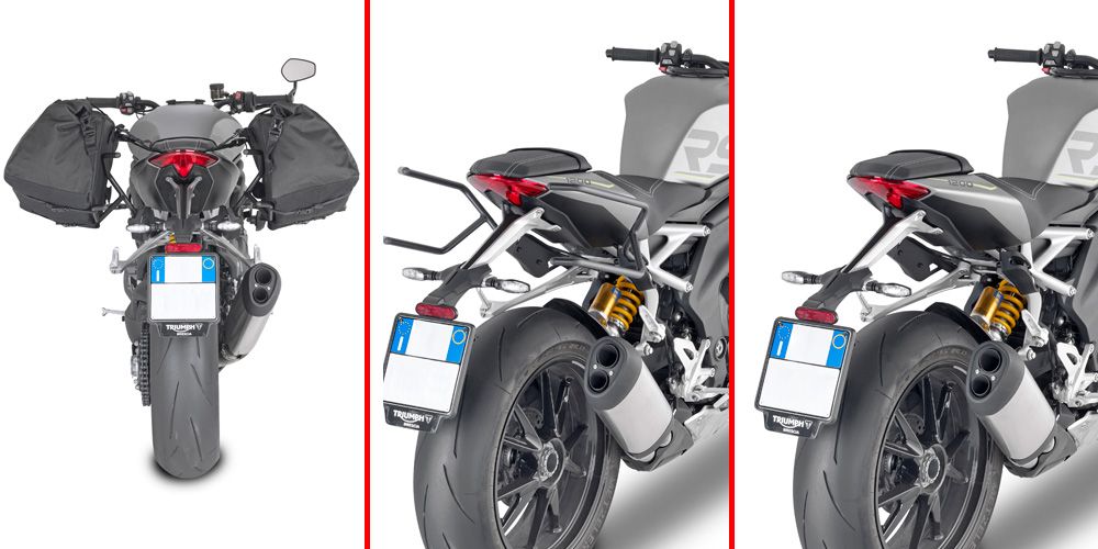 Trubkové podpěry bočních brašen pro rychlosundávací systém REMOVE-X - lze použít pro téměř jakékoli boční brašny. Nový revoluční systém uchycení ke stupačce spolujezdce. Ilustrační foto z moto Triumph. Pasuje ina model V4S.