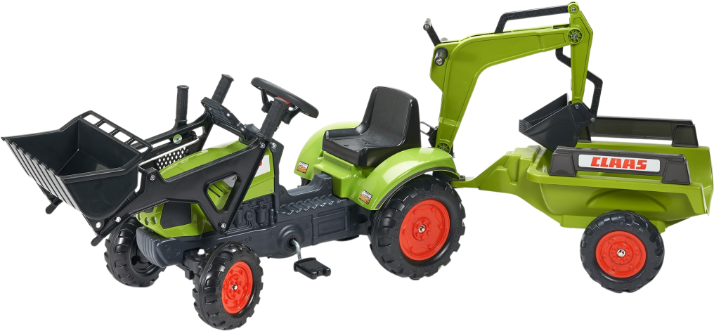 Traktor šlapací Claas Arion 410 s přední a zadní lžící a valníkem zelený. Z vysoce odolného a kvalitního plastu. Velikost 181×42×62 cm Věk 2+. Všechny traktory Falk jsou testovány na 30kg – dle požadavků evropských norem. Vyrobeno ve Francii.