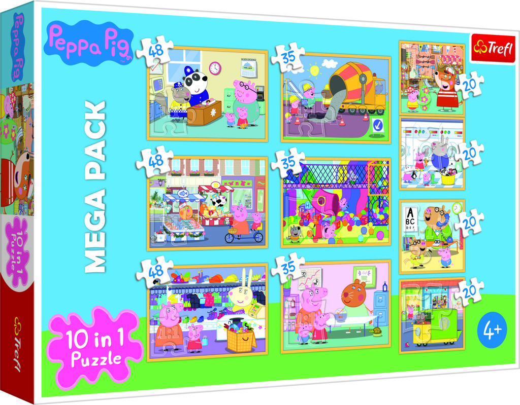 Mega Pack dětských puzzle s motivem animovaného seriálu Prasátko Peppa od výrobce Trefl. Balení obsahuje: čtyři puzzle s 20 dílky, tři puzzle s 35 dílky a tři puzzle s 48 dílky. Doporučeno pro děti od 4 let. Rozměr složeného puzzle 4x (16,7 x 15,6 cm), 6x ( 22,3 x 15,6 cm)