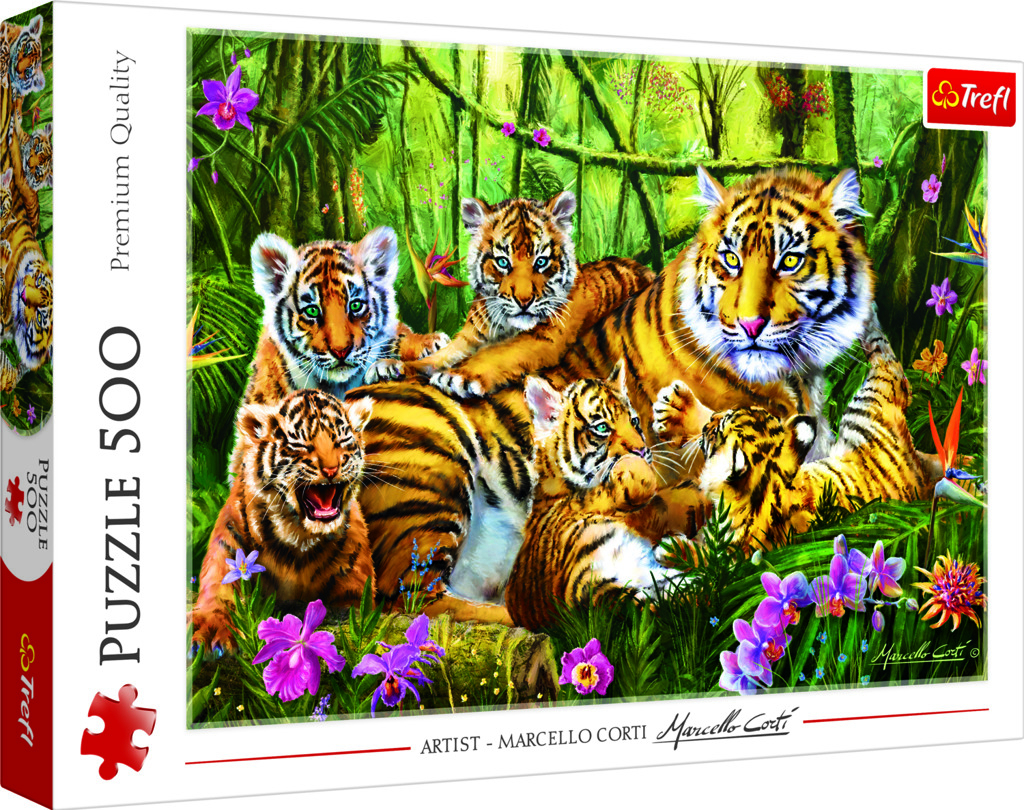 Puzzle 500 dílků zobrazující tygří rodinu s tropickou krajinou v pozadí. Po složení vznikne obrázek o rozměrech 48x34 cm.