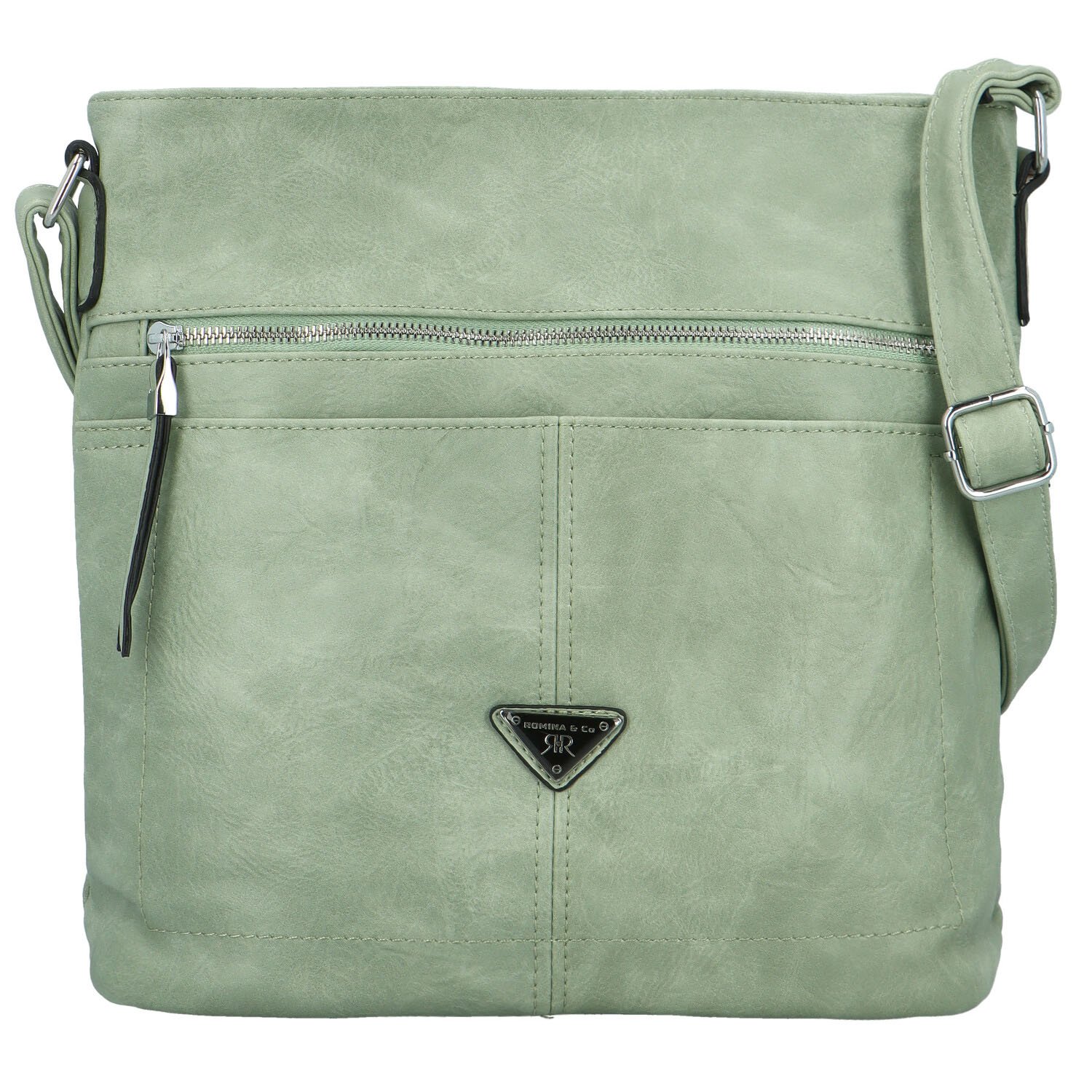 Koženková kabelka s jemným leskem a mírně strukturovaným povrchem. Přední strana disponuje vodorovnou zipovou kapsou a trojúhelníkovým logem značky ve stříbrné barvě.Hlavní prostor uzavřete zipem. Uvnitř je středová zipová kapsa, které vám zajistí praktické rozvrhnutí vašich věcí, k tomu vám poslouží menší boční kapsičky.