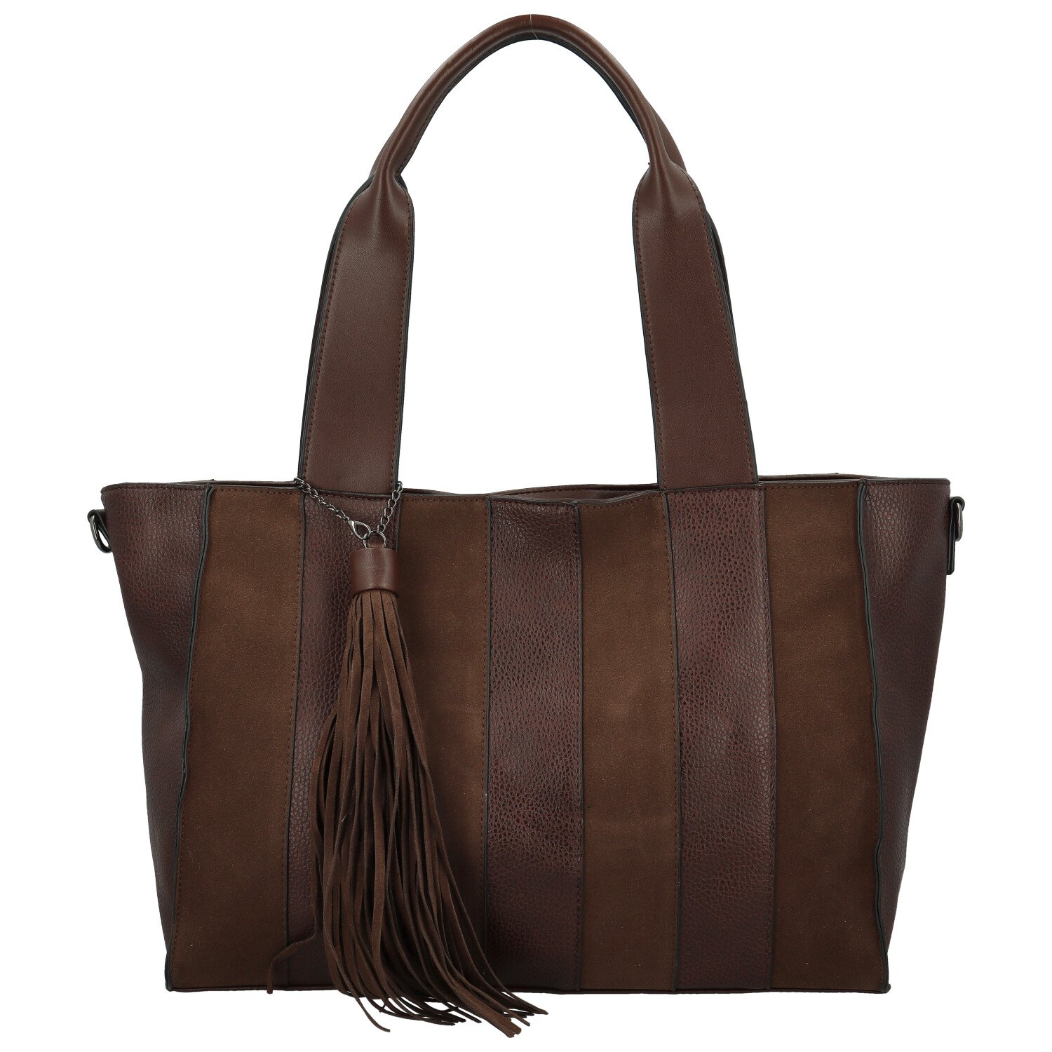 Přední část hraje s kontrastem dvou odstínů v elegantních svislých pruzích, které jí dávají moderní a výrazný vzhled. Na uchu se vyjímá velký střapec, hravý detail, který kabelce přidává osobnost. Pevné uši padnou přesně na rameno, takže se nosí pohodlně.