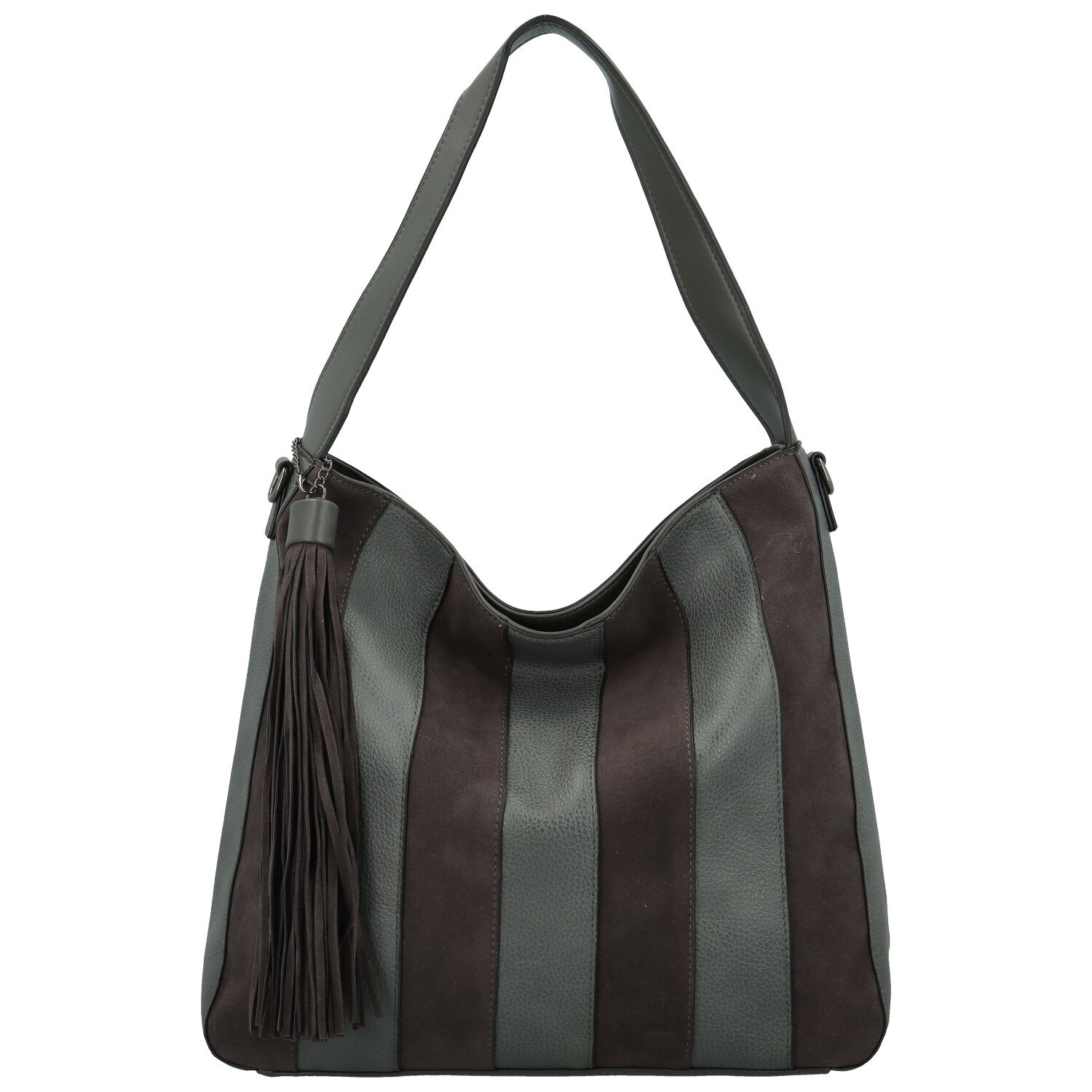Elegantní pevné ucho padne přesně na rameno a hned na něm upoutá pozornost hravý dlouhý střapec, který kabelce dodává šmrnc. Přední část je řešena ve svislých pruzích dvou odstínů, takže působí originálně a neotřele.