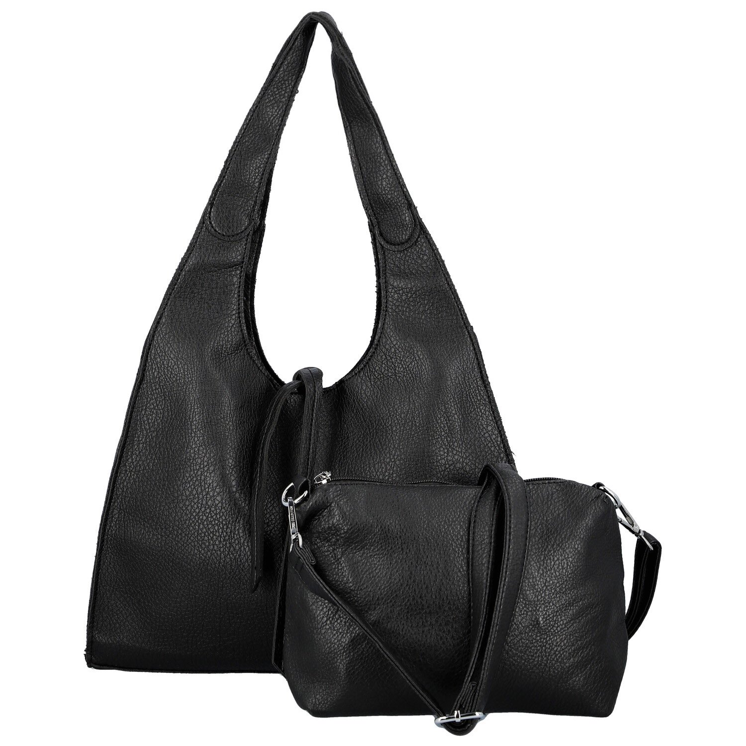 Větší kabelka zaujme svým moderním trojúhelníkovým střihem a pevnými uchy, které se pohodlně nosí na rameni. Hlavní kapsa na zip ukrývá dostatek prostoru pro všechny vaše denní nezbytnosti. Součástí setu je také menší kabelka, kterou můžete využít jako praktický organizér do větší kabelky, nebo ji během chvilky proměnit v crossbody tašku díky dlouhému nastavitelnému popruhu.