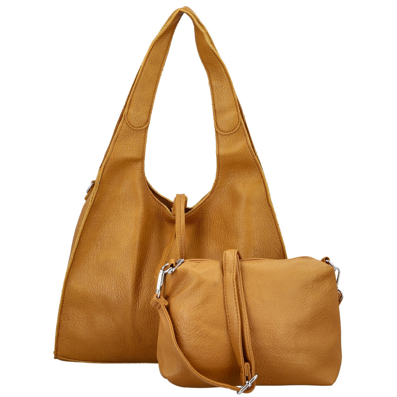 Větší kabelka zaujme svým moderním trojúhelníkovým střihem a pevnými uchy, které se pohodlně nosí na rameni. Hlavní kapsa na zip ukrývá dostatek prostoru pro všechny vaše denní nezbytnosti. Součástí setu je také menší kabelka, kterou můžete využít jako praktický organizér do větší kabelky, nebo ji během chvilky proměnit v crossbody tašku díky dlouhému nastavitelnému popruhu.