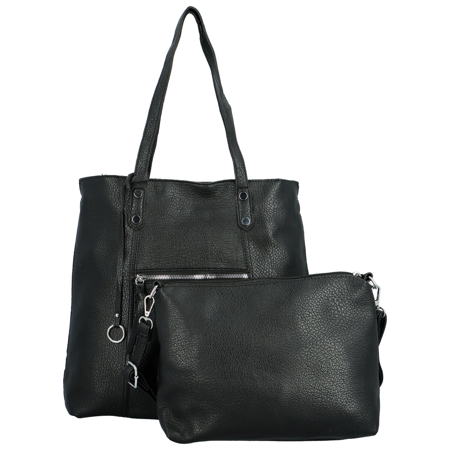 Velká taška má dlouhé uši, které dobře sedí na rameni. Otevírá se zipem a uvnitř najdete menší kabelku, ke které můžete připnout dlouhý, nastavitelný popruh a nosit ji jako crossbody a nebo si ji nechat uvnitř a využít jako kosmetickou taštičku.