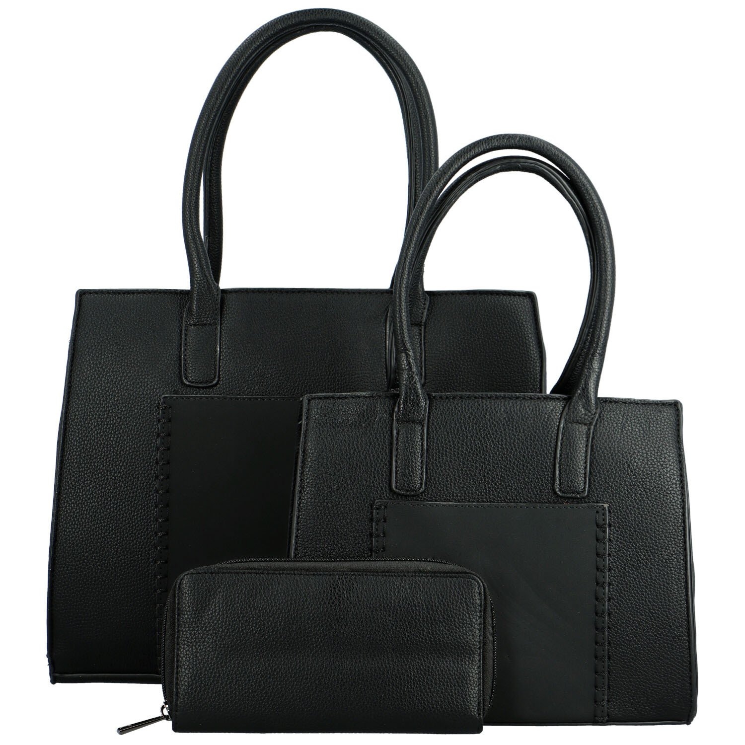 První kabelka je střední velikosti a pevně drží tvar. Po otevření hlavního zipu najdete uvnitř dostatek prostoru pro Vaše osobní věci. Nechybí ani menší kapsičky v podšívce a malá zipová kapsa na zadní straně kabelky. Druhá kabelka je stejná jen menší.