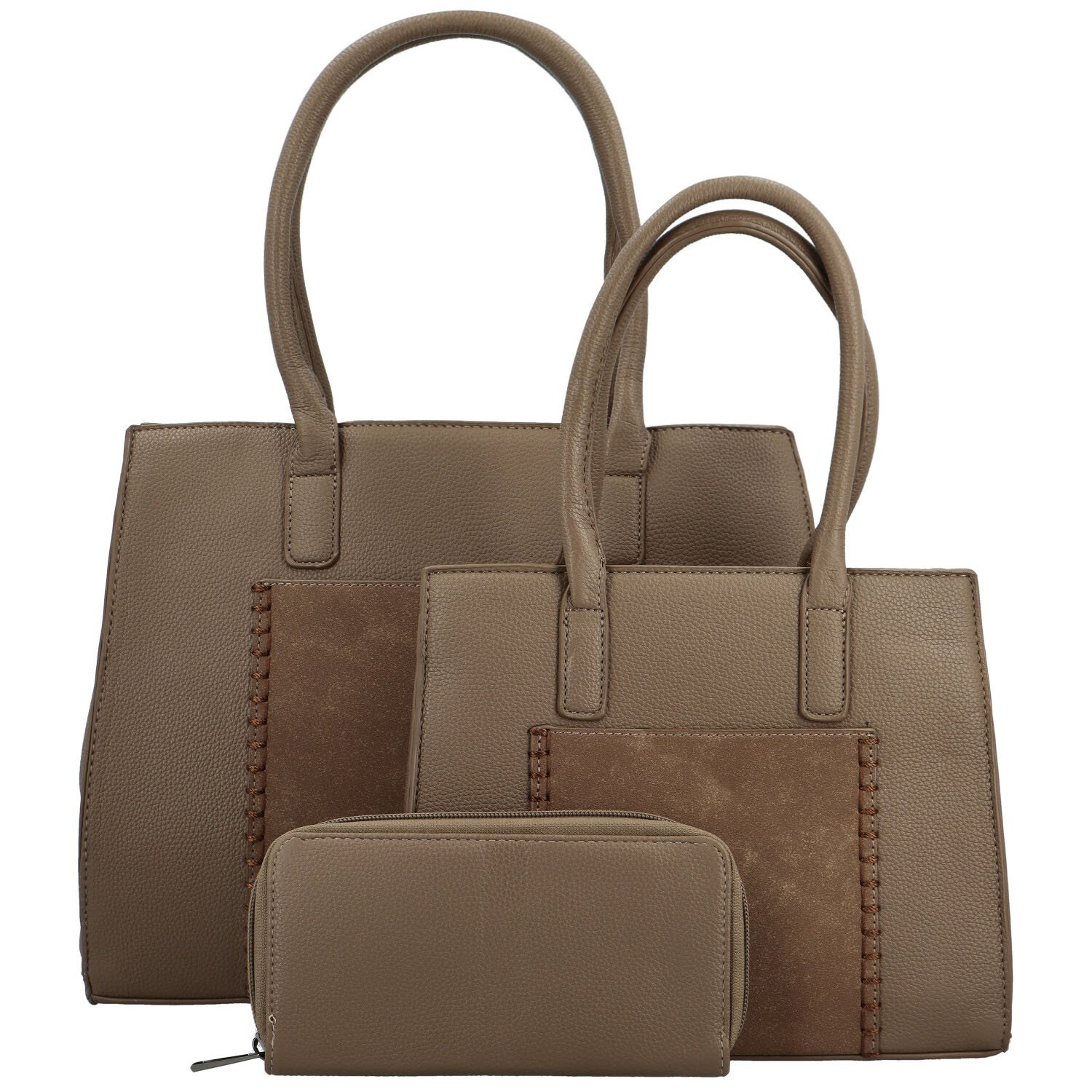První kabelka je střední velikosti a pevně drží tvar. Po otevření hlavního zipu najdete uvnitř dostatek prostoru pro Vaše osobní věci. Nechybí ani menší kapsičky v podšívce a malá zipová kapsa na zadní straně kabelky. Druhá kabelka je stejná jen menší.
