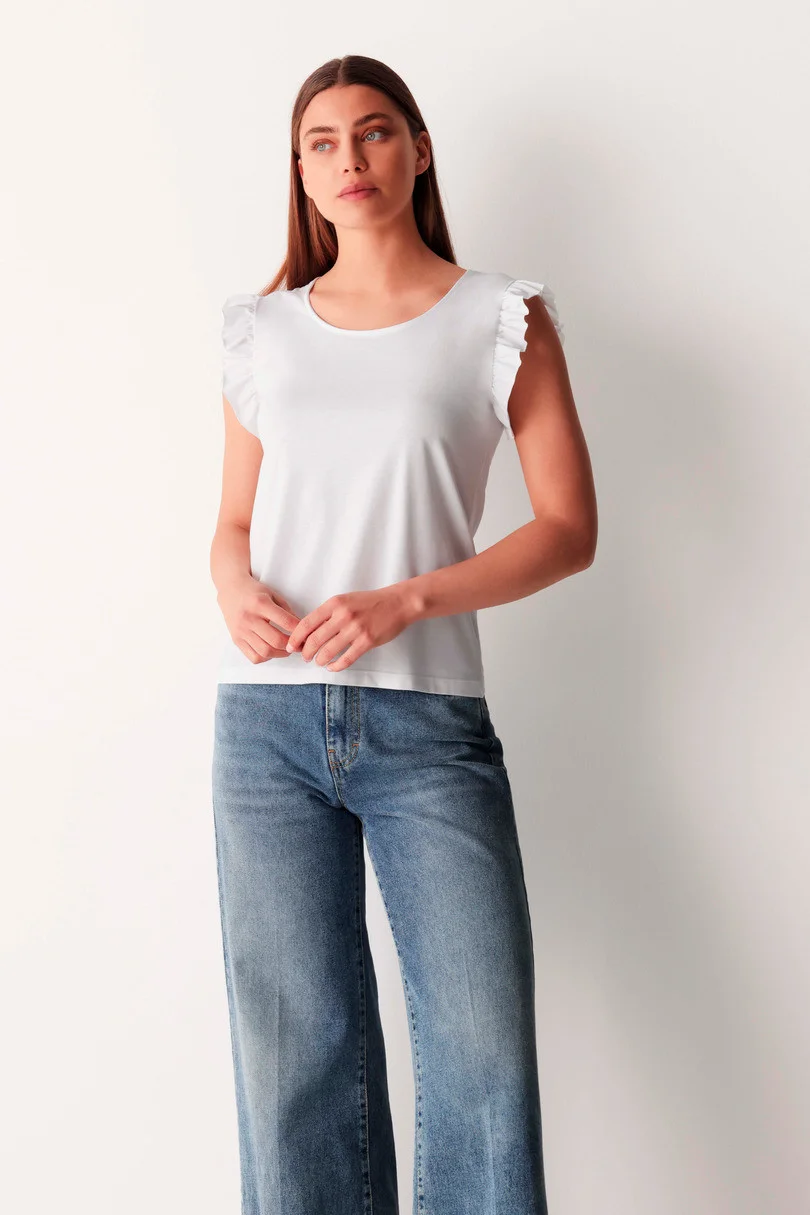 Koszulka damska Cotonella ADB77 to propozycja dla kobiet ceniących minimalizm i elegancję na co dzień. Wykonana w 100% z naturalnej bawełny, zapewnia komfort noszenia i przewiewność nawet w najcieplejsze dni. Klasyczny, okrągły dekolt oraz subtelne falbanki przy ramionach dodają jej dziewczęcego uroku, a brak nadruku podkreśla uniwersalny charakter modelu. Koszulka idealnie komponuje się zarówno z jeansami, jak i spódnicami, tworząc niezobowiązujące, a zarazem stylowe stylizacje.