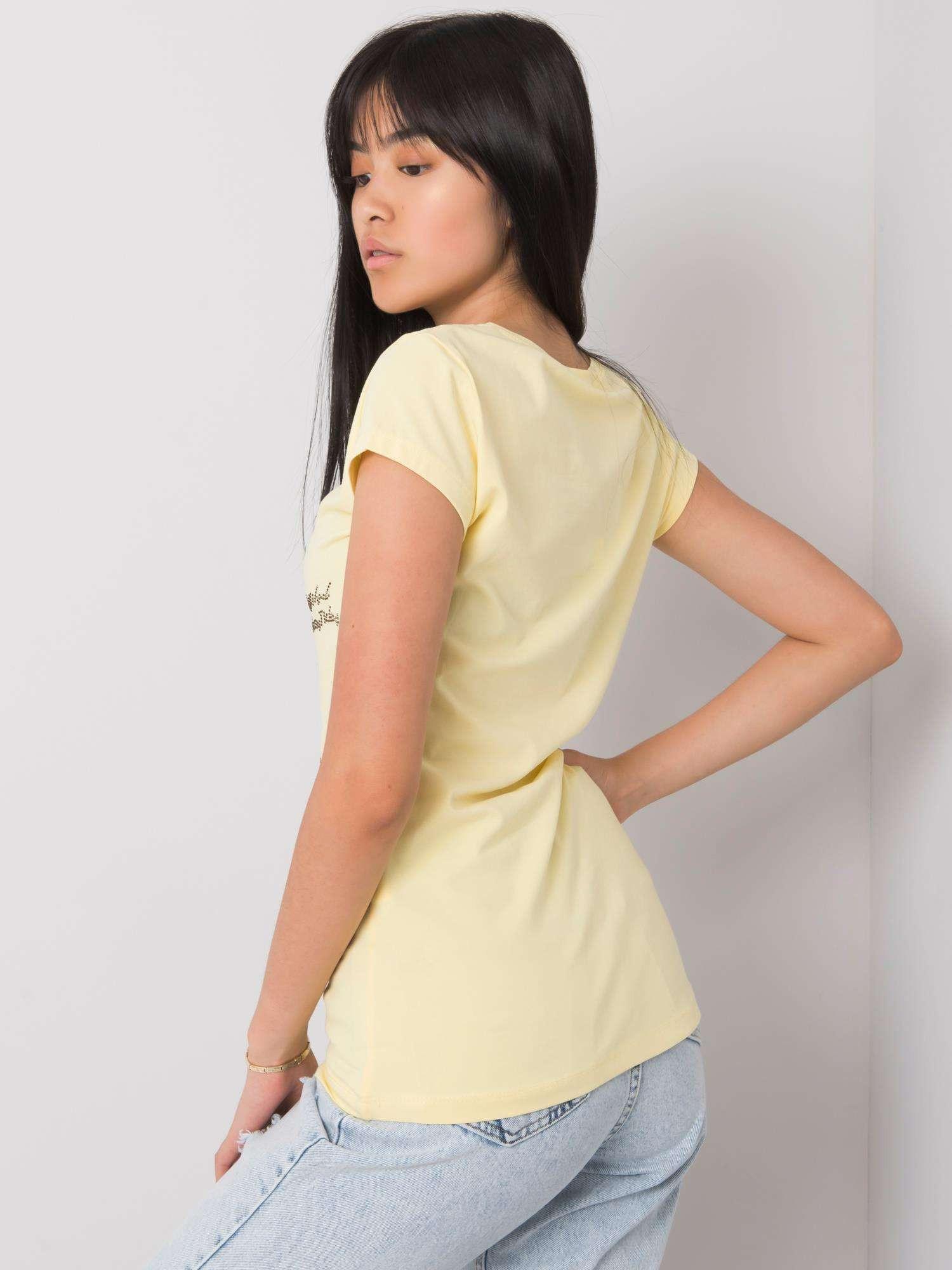 Zářivě žluté dámské tričko s kamínky. Příslušenství: kamínky složení látky: 90 % bavlna, 10 % elastan způsob praní: praní v pračce na 30 °C Modelka má na sobě velikost S. Rozměry modelky: výška 167 cm, prsa 73 cm, pas 64 cm, boky 91 cm. Rozměry trička ve velikosti S měřené na plocho: šířka v podpaží - 42 cm, celková délka - 65 cm