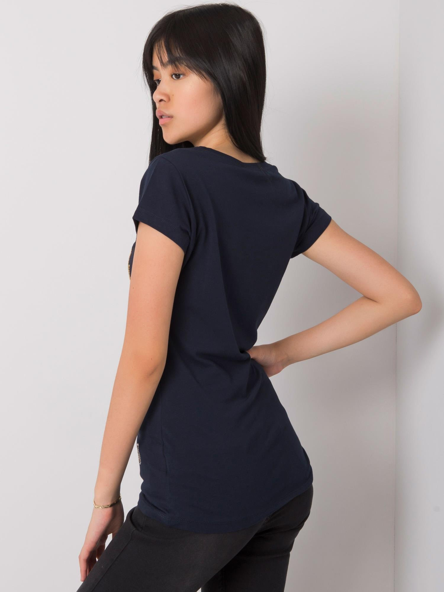 Námořnicky modré dámské tričko s aplikací. Příslušenství: kamínky složení látky: 90 % bavlna, 10 % elastan způsob praní: praní v pračce na 30 °C Modelka má na sobě velikost S. Rozměry modelky: výška 167 cm, prsa 73 cm, pas 64 cm, boky 91 cm. Rozměry trička ve velikosti S měřené na plocho: šířka v podpaží - 42 cm, celková délka - 66 cm