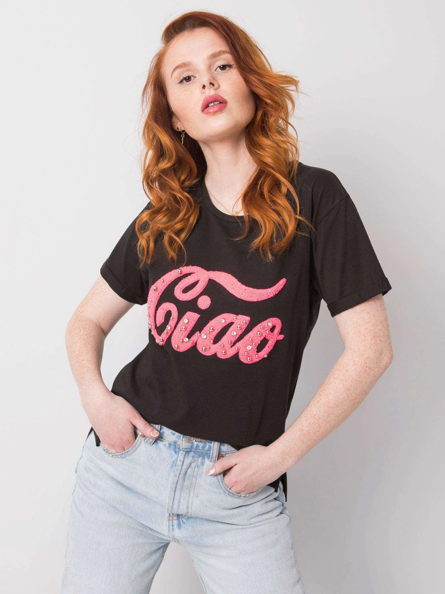 Černé dámské tričko s aplikací. složení látky: 100% bavlna způsob praní: praní v pračce na 30 °C Modelka má na sobě velikost S. Rozměry modelky: výška 165 cm, prsa 83 cm, pas 64 cm, boky 90 cm. Rozměry trička velikosti S měřené na plocho: šířka v podpaží - 46 cm, celková délka - 63 cm
