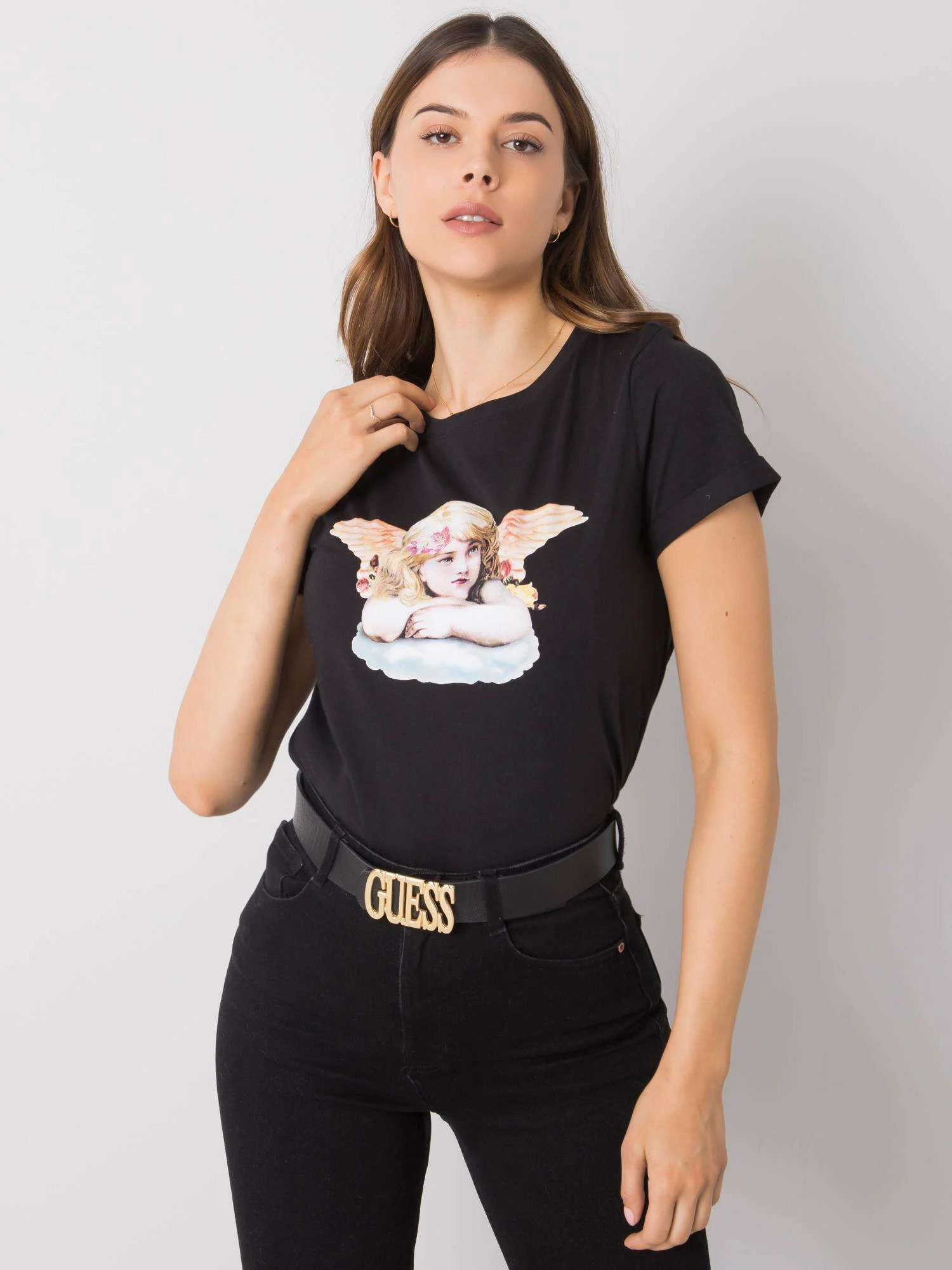 RUE PARIS Černé dámské tričko s potiskem. složení látky: 100% bavlna způsob praní: praní v pračce na 30 °C Modelka má na sobě velikost S. Rozměry modelky: výška 177 cm, poprsí 90 cm, pas 63 cm, boky 94 cm. Rozměry trička ve velikosti S měřené na plocho: šířka v podpaží - 43 cm, celková délka - 65 cm