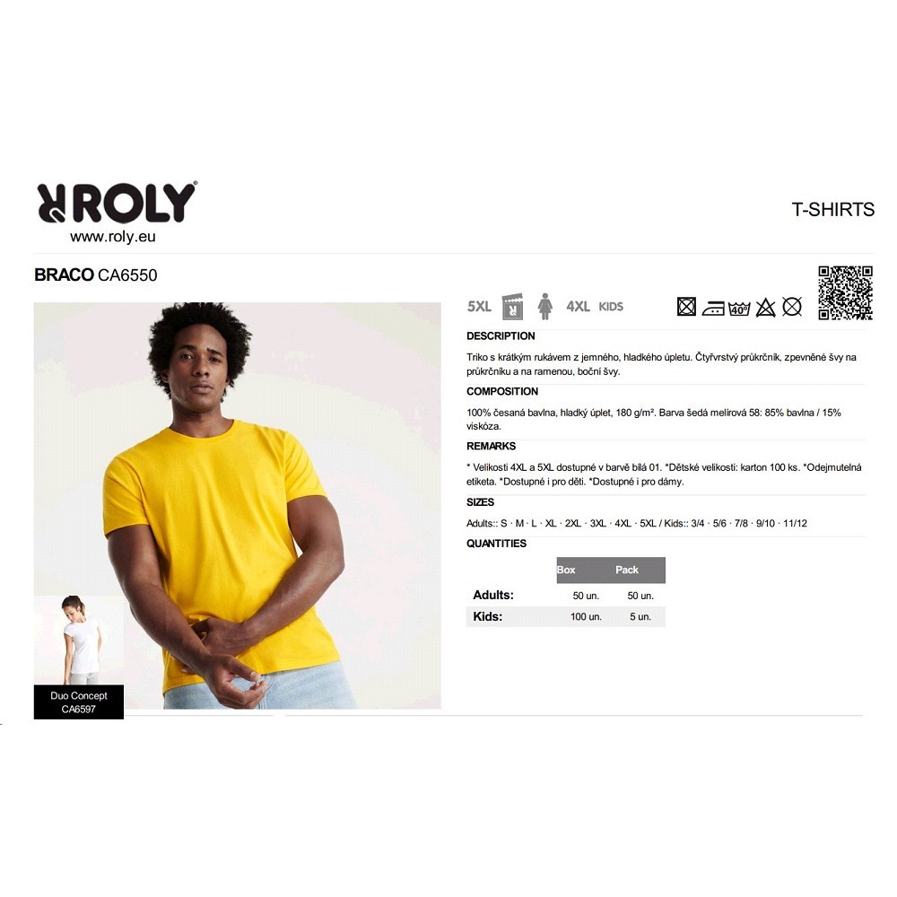 Tričko BRACO od španělské firmy ROLY Popis produktu: Tričko BRACO od renomované španělské firmy ROLY je mezi zákazníky velmi oblíbené díky své vynikající kvalitě a vysoké gramáži. Toto tričko je ideální volbou pro ty, kteří hledají pohodlný a odolný oděv pro každodenní nošení. Klíčové vlastnosti: · Materiál: Vyrobeno ze 100% česané bavlny, která poskytuje měkkost a pohodlí. Hladký úplet s gramáží 180 g/m˛ zajišťuje trvanlivost a kvalitní vzhled i po opakovaném praní. · Design: Tričko je vybaveno čtyřvrstvým průkrčníkem a zpevněnými skrytými švy na průkrčníku a na ramenou, což zvyšuje jeho odolnost a komfort při nošení. · Střih: S bočními švy pro lepší přizpůsobení tvaru těla. Velikosti: · Standardní velikosti: S - XXL · Speciální objednávky: Velikost 3XL má samostatnou objednací kartu. Za příplatek cca 15 Kč lze objednat i velikosti 4XL a 5XL v bílé barvě. Dostupné barvy: · Bílá · Černá · Tmavě šedá · Žlutá · Oranžová · Světlá červená · Tmavá červená · Růžová · Tyrkysová · Královská modrá · Navy (tmavě modrá) · Pistáciová · Světle zelená · Tmavě zelená Proč si vybrat tričko BRACO? Tričko BRACO je ideální volbou pro každého, kdo hledá kvalitní a pohodlné tričko, které vydrží. Díky česané bavlně a preciznímu zpracování je toto tričko nejen pohodlné, ale také velmi odolné. Skvěle se hodí pro každodenní nošení i pro speciální příležitosti. Neváhejte a pořiďte si tričko BRACO od firmy ROLY. Vyberte si svou velikost a barvu a uveďte je do poznámky při objednávce. Dopřejte si kvalitu a komfort, který vám toto tričko nabízí. Velikost 3XL má samostatnou objednací kartu. Pro velikosti 4XL a 5XL je k dispozici pouze bílá barva za příplatek cca 15 Kč. p.MsoNormal, li.MsoNormal, div.MsoNormal{ margin-top:0cm; margin-right:0cm; margin-bottom: 1.0pt; margin-left:0cm; line-height:1.07; font-size:11.0pt;}