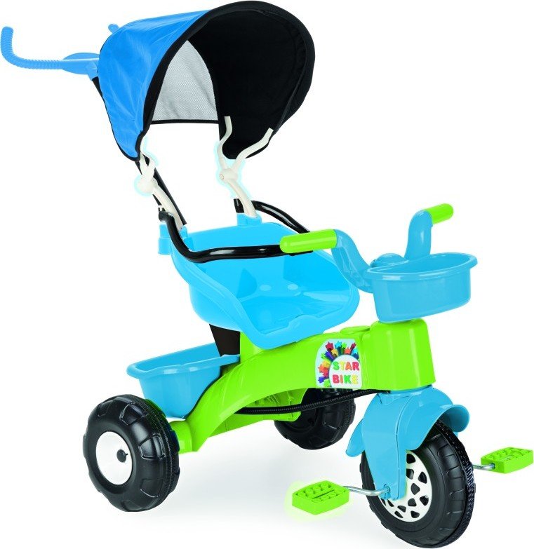 Tříkolka Star s vodící tyčí – s košíkem. Na rukojeti ovládání šlapek, takže díte nemůže šlapat bez povolení rodičů. Maximální nosnost 35 kg.