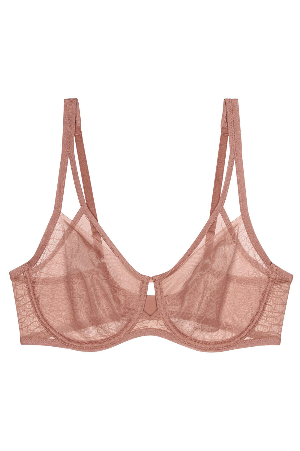 Podprsenka značky Triumph, model 10215906 Signature Sheer W01 EX. Má drátky, které podporují a tvarují prsa. Výrobek má nastavitelná ramínka, která nejsou odnímatelná. Plastové háčky na ramínkách. Zapínání na háčky. Místo zapínání: zadní část. 2 řady vertikálních háčků. 3 úrovně horizontálních háčků. Výrobek je vyroben z 59 % polyamidu, 41 % elastanu. Dámské oblečení.