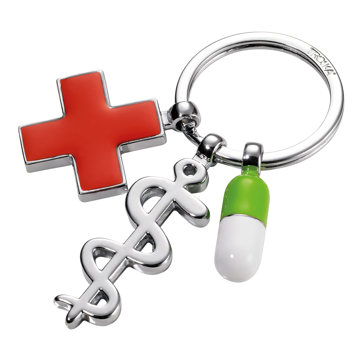 Klíčenka se 3 přívěsky - Aeskulapova hůl, červený kříž a pilulka. Kombicace zelené, bílé, červené a stříbrné.rozměry: 83 x 60 x 10 mmhmotnost: 38 gmotiv zdraví - Aeskulapova hůl, čerevený kříž, pilulkavhodná i jako dárekobsah balení: 1 ks