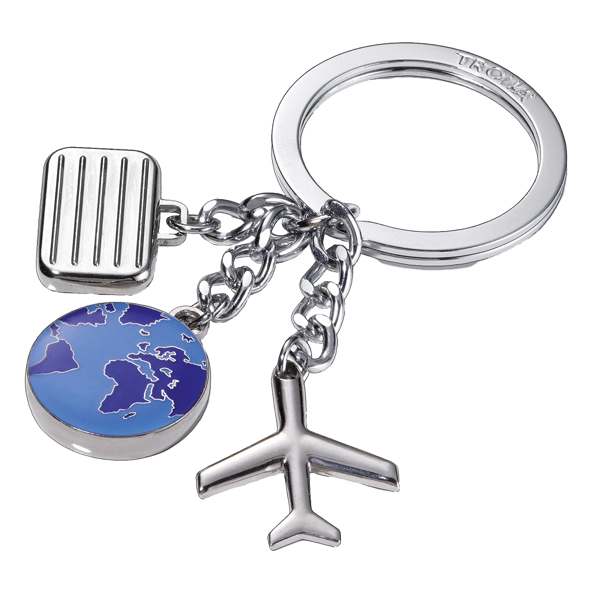 Klíčenka se 3 cestovními přívěsky - letadlo, kufr, glóbus. Kombinace modré a stříbrné barvy.rozměry: 85 x 35 x 5 mmhmotnost: 27 gmotiv cestování - letadlo, kufr, glóbusvhodná i jako dárekobsah balení: 1 ks