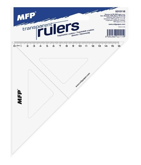 Školní plastové pravítko pravoúhlý trojúhelník s ryskou o délce 16 cm. Pravítko svírá úhly 45°/90°/45°. Barva: transparentní Pravítko je zdravotně nezávadné a neobsahuje ftaláty.
