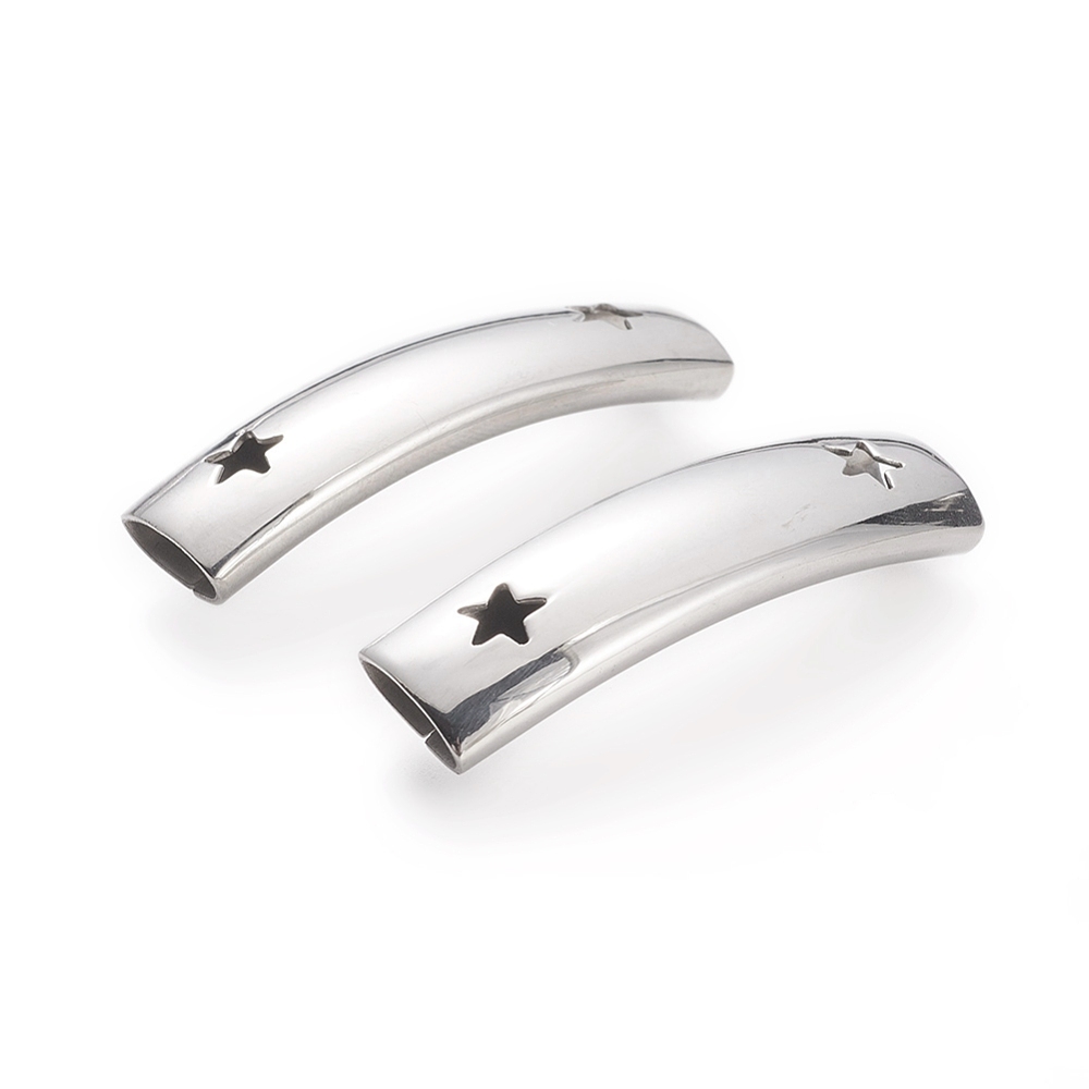 Kvalitní korálek ve tvaru prohnuté trubičky s otvory ve tvaru hvězdy Tento kvalitní korálek ve tvaru prohnuté trubičky o délce 36 mm a šířce 10 x 8 mm s průvlekem přibližně 8 x 4 mm je ideálním doplňkem pro výrobu romantických a elegantních šperků. Platinové provedení v kombinaci se dvěma otvory ve tvaru hvězdy dodává tomuto korálku jemný a stylový vzhled, který zaujme na první pohled. Vyrobený je z nerezové oceli typu 201, což korálku zaručuje dlouhou životnost a odolnost proti korozi. Díky širokému průvleku můžete snadno uschovat uzel návleku nebo použít i širší návlekový materiál, což z něj činí všestranný prvek pro různé druhy šperků. Prodáváme ho po jednom kusu, což vám umožňuje přizpůsobit množství přesně podle vašich potřeb. Tento korálek je perfektní volbou pro ty, kteří chtějí svým šperkům dodat dotek lásky a elegance s originálním designem.