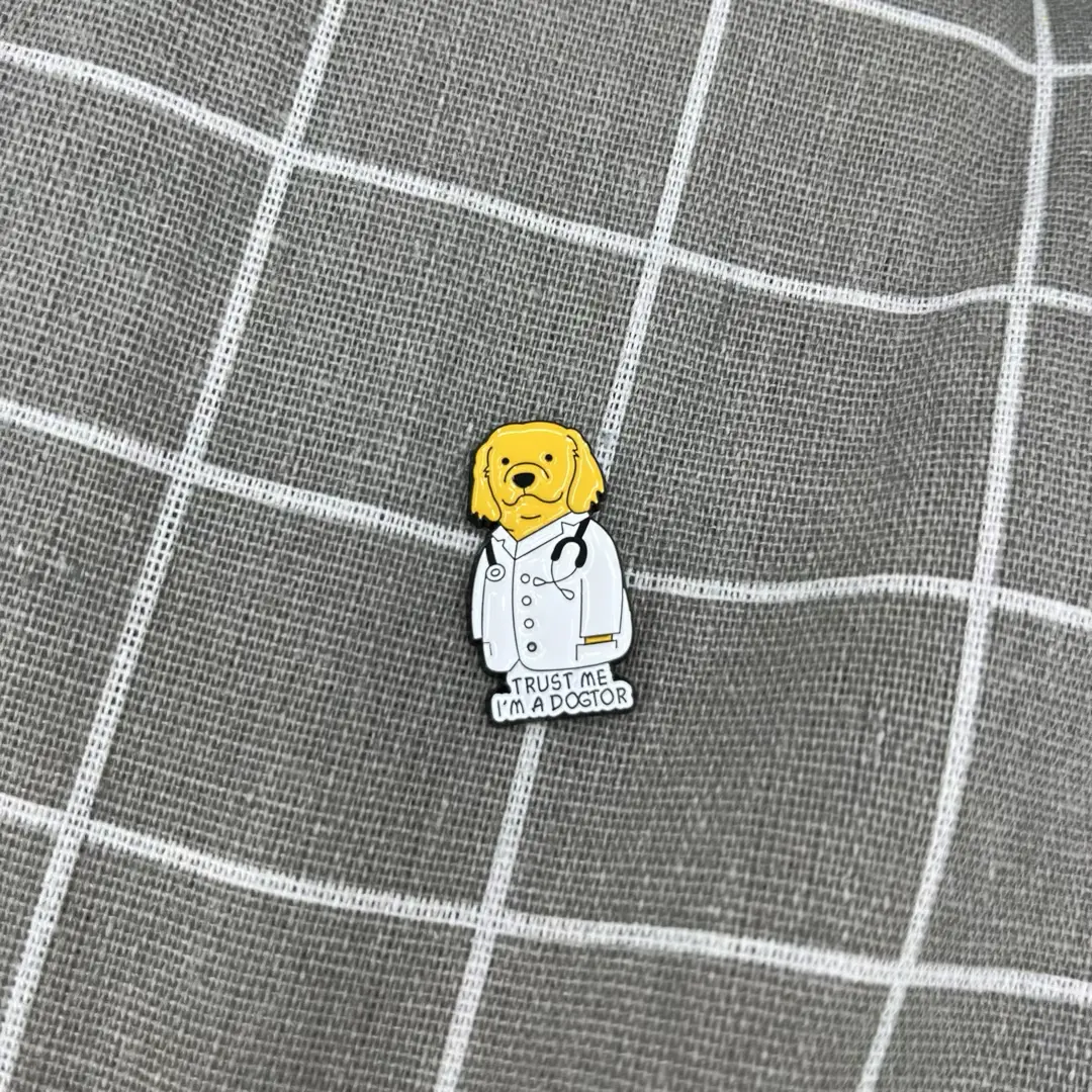 Trust me I’m a dogtor / Věř mi, jsem psoktor (doktor pes)\nVtipný smaltovaný odznáček se zlatým retrívrem převlečeným za doktora s nápisem „Trust me, I’m a dogtor“. Roztomilá hra se slovy „doctor“ a „dog“ potěší všechny milovníky psů, humoru i originálních doplňků.\n📌 Kvalitní smaltovaný odznáček s veselým designem\n🐶 Pes v bílém plášti a se stetoskopem – ideální pro milovníky zvířat\n🎒 Hodí se na batoh, tašku, mikinu i klopu saka\n🎁 Skvělý dárek pro pejskaře, veterináře i přátele se smyslem pro humor\nTento pin je roztomilým připomenutím, že psi jsou ti nejlepší „lékaři“ – dokáží léčit úsměvem a radostí.