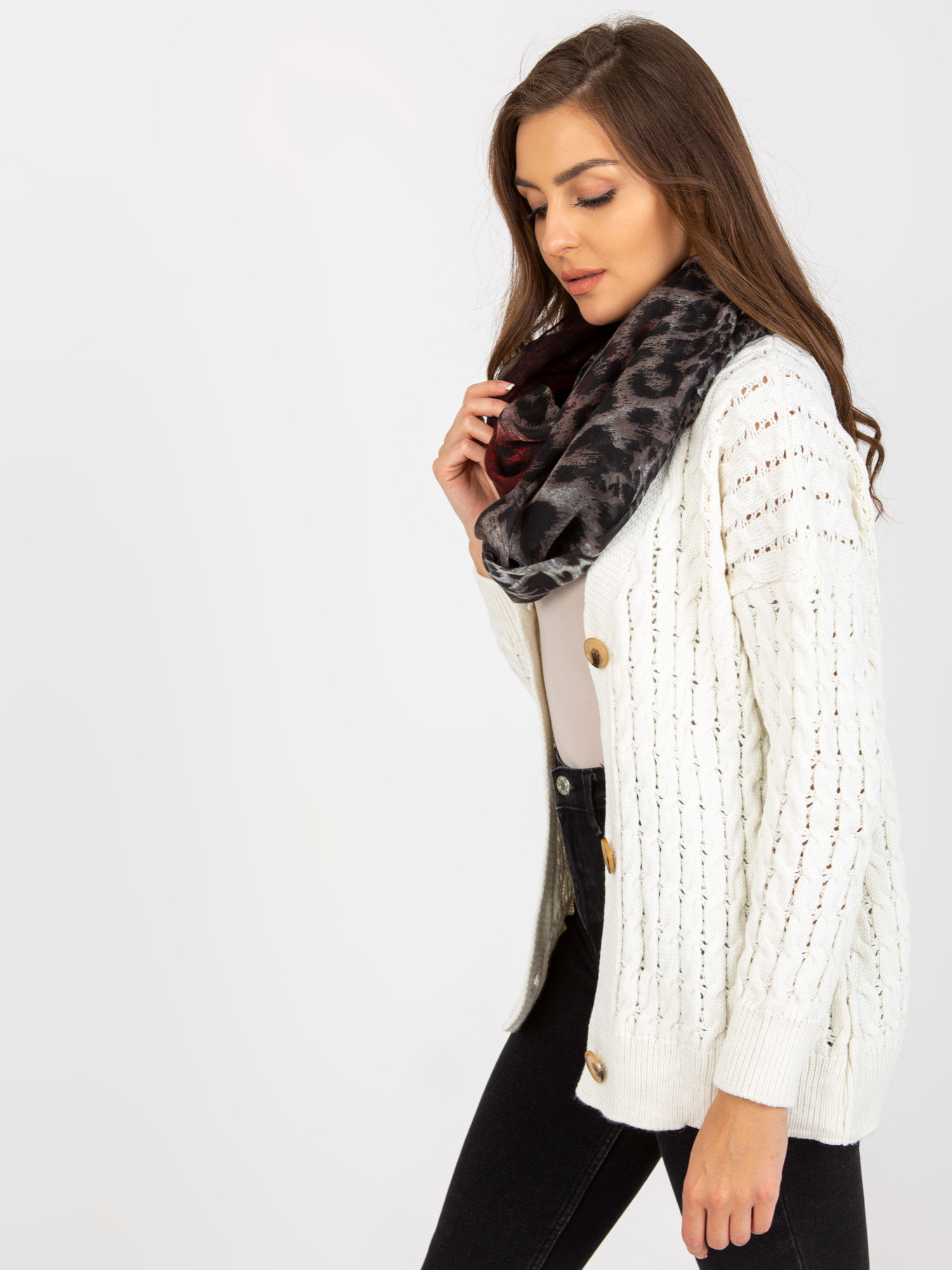 Černo-červený komínový šátek se zvířecím vzorem . Kód produktu: AT-KM-241357.03P dominantní design: zvířecí motiv Rozměry: přibližně. 115 x 172 cm
