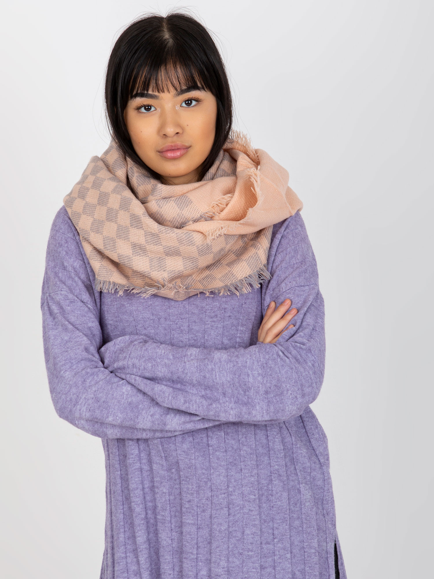 Světle růžový a šedý dámský vlněný komín . Kód produktu: AT-KM-9501.10 dominantní vzor: kontrola Rozměry: délka - 82 cm, šířka - 53 cm
