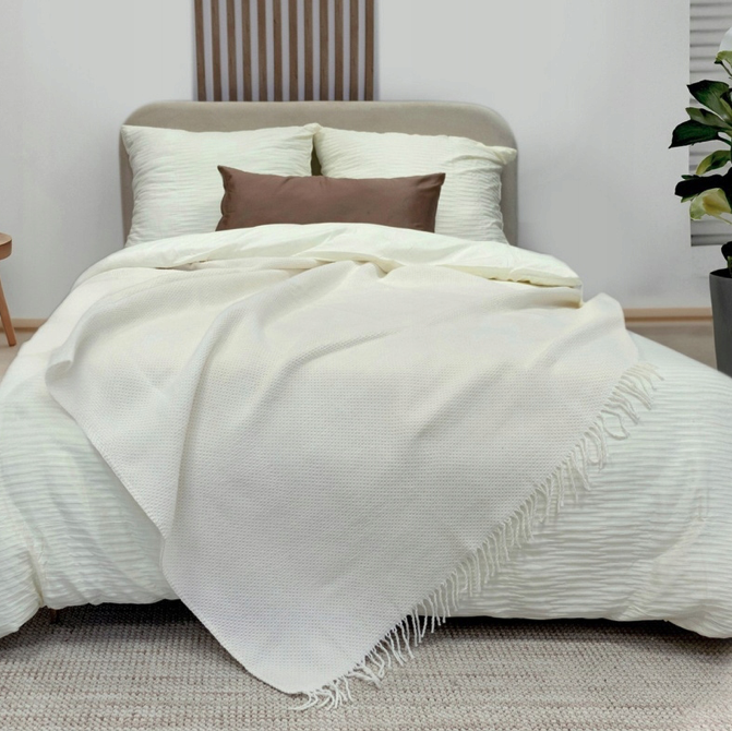 Tato měkká a příjemná turecká deka vyrobená z vysoce kvalitní bavlny je ideálním společníkem pro chladnější večery. Jeho jemná tkaná textura vypadá přirozeně a elegantně, takže se skvěle hodí do klasických i moderních interiérů. Deka je lehká, vzdušná a příjemná na dotek, díky čemuž se hodí jako přehoz přes postel nebo jako pohodlný doplněk k pohovce. Ozdobné střapce dodávají dece stylový vzhled a jemný dekorativní akcent. Díky příjemnému materiálu je vhodný i pro citlivou pokožku. Ideální jako dárek nebo jako doplněk pro zútulnění vašeho domova. Specifikace: Barva: krémová Materiál: 100% bavlna Tolerance rozměrů: +/- 5% Informace o praní najdete na štítku Snažíme se zajistit co nejpřesnější fotografie, nicméně barvy se mohou lišit v závislosti na nastavení vašeho monitoru, což je důležité mít na paměti při výběru produktu online.