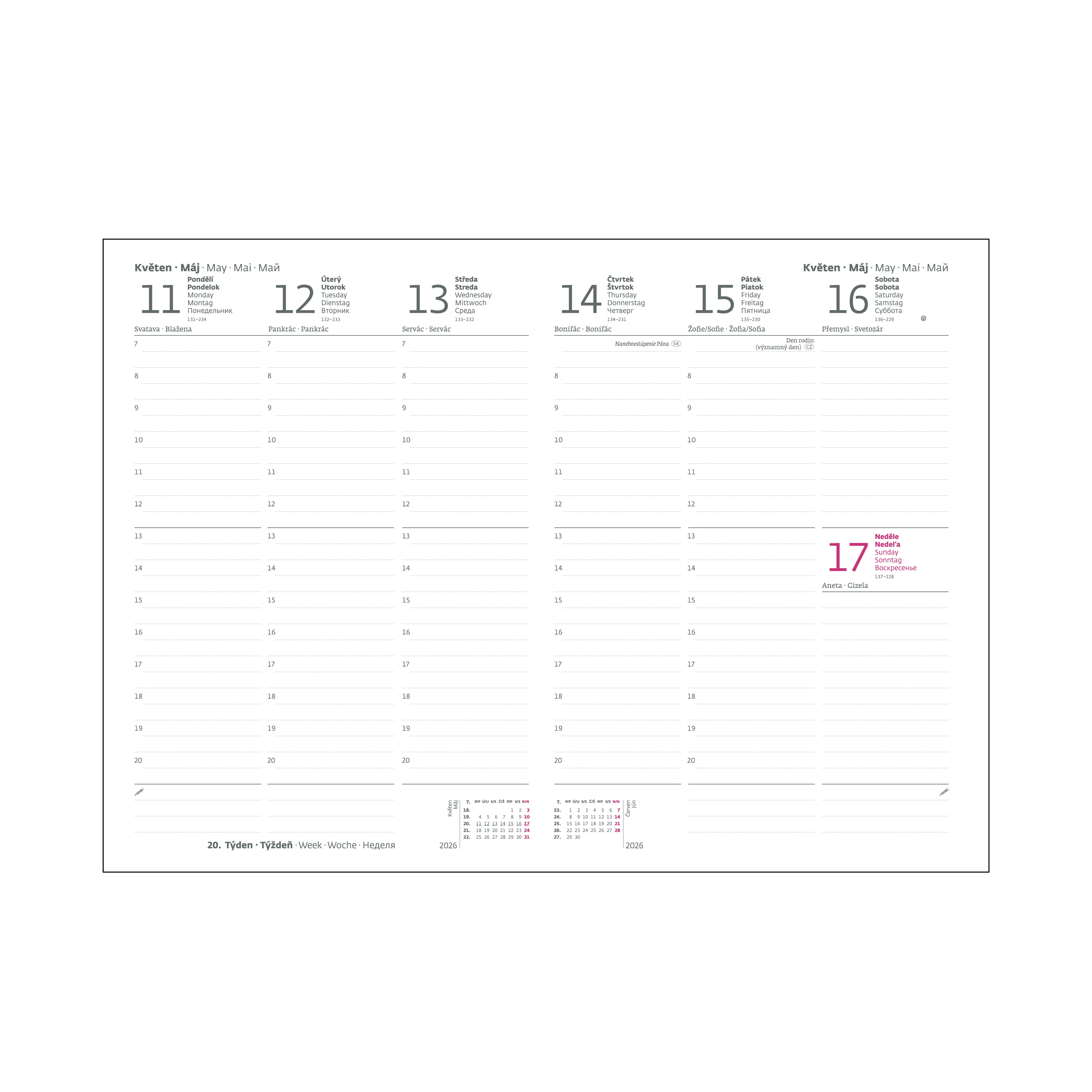 Objevte praktický diář se 128 stranami provedený v trendy barvách z kolekce VERDE. Moderní vzhled dotváří povrchová úprava Soft touch lamino s UV lakem. Design je doplněn kulatými rohy a perforací pro snadné odtrhávání stránek. Tento diář je ideální pro každodenní organizaci a plánování jak v profesním, tak v osobním životě, spojující funkčnost s estetikou. Rozměry: 143 x 205 x 12 mm Počet stran: 128 Materiál obálky: Soft touch lamino mat + UV lak Informační strany: osobní údaje plánovací kalendář 2026 přehledný kalendář 2026/2027 křestní jména / mezinárodní svátky mezinárodní telefonní předvolby, důležitá telefonní čísla daňový kalendář 2026 prostor pro poznámky, adresář Kalendárium: cz/sk jména cz/sk státní svátky dny a měsíce v 5 jazycích (CZ, SK, ENG DE, RUS) počet dnů od začátku a do konce roku měsíční fáze číslo týdne mapa CZ, SK, EU kulaté rohy perforace k odtržení Zakupte produkt Týdenní diář 2026 Karton P+P A5 - VERDE hořčice z kategorie Kalendáře, diáře | Diáře 2026 | Týdenní 2026 | Bezobrázková obálka od výrobce Karton P+P za cenu 89 Kč.