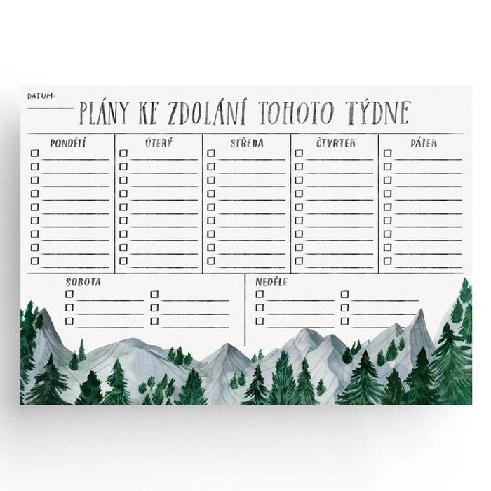 Týdenní plánovač vám od pondělí do neděle pomůže s plněním úkolů. Přehledně si podle dnů zaznamenejte svoje úkoly a při jejich zdolání odškrtněte. Na každý týden vás čeká jeden list (počet listů 52). Plánovač je s autorským designem hor.