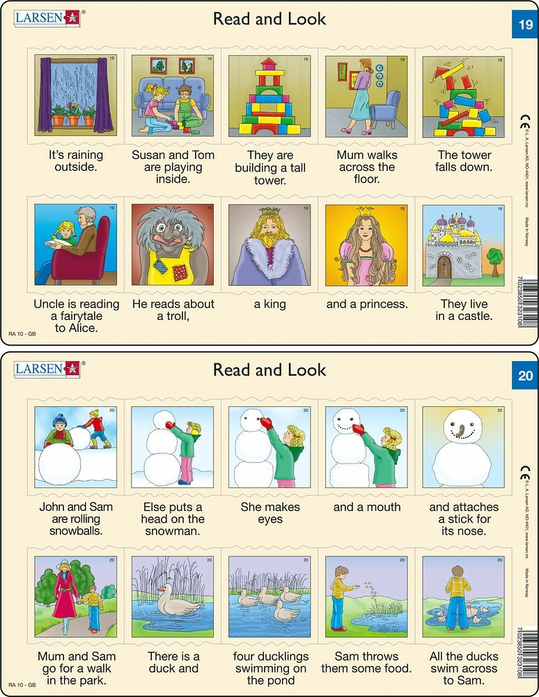 Puzzle Angličtina – krátký text RA10 obsahuje 10 dílků, každý s malým obrázkem. Pod každým dílkem se nachází text, který se vztahuje k příslušnému obrázku. Přečti text a najdi k tomu odpovídající obrázek. Každý dílek lze umístit pouze na přesně určené místo, což umožní dětem ověřit, zda správně spojily obrázek a text.