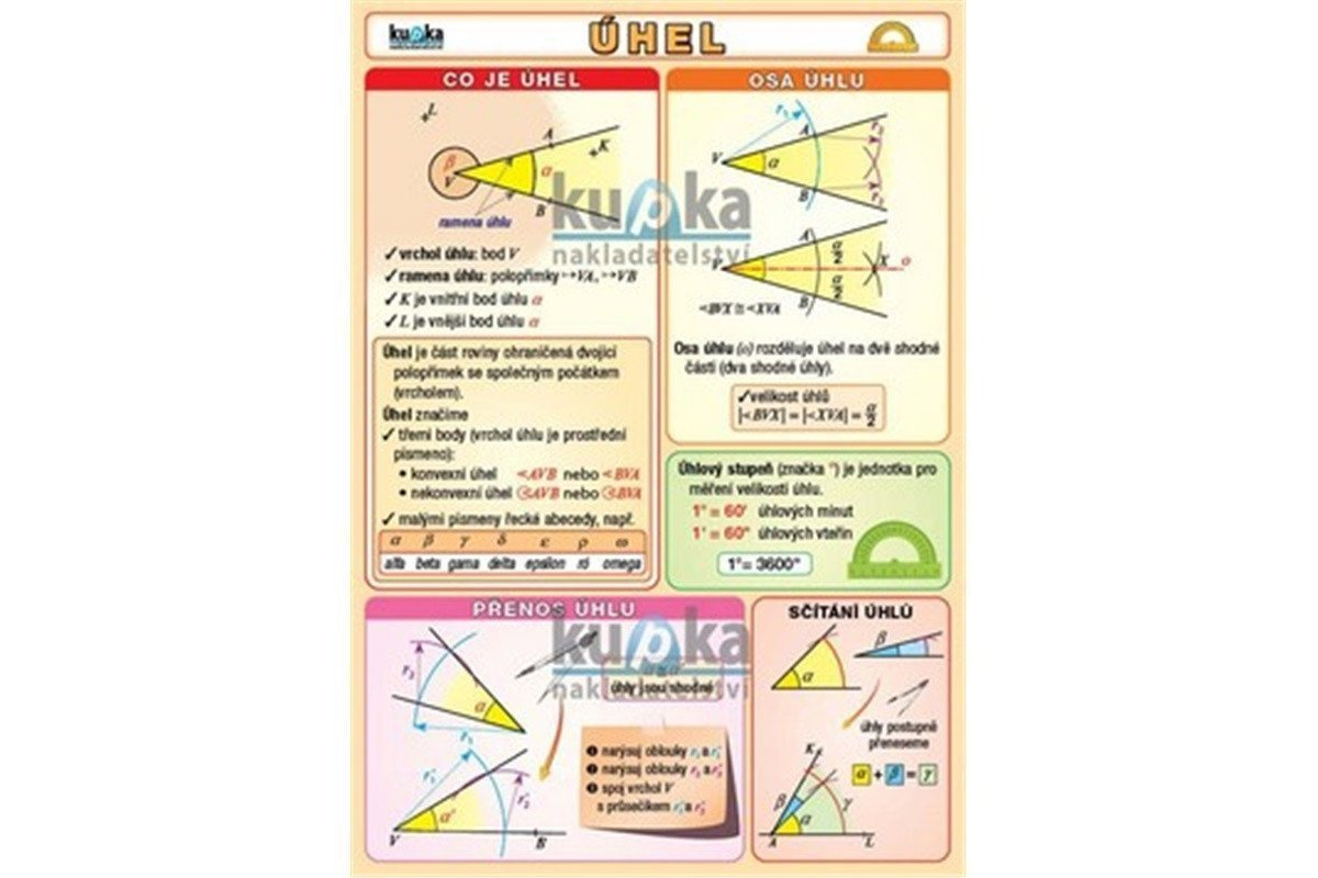 <p>Úhel (pro 2. stupeň ZŠ) obsahuje základní pojmy, konstrukce osy úhlu, přenos úhlu, rozdělení úhlů podle velikosti, dvojice úhlů.</p><p>co je úhel, ramena úhlu, značení úhlu</p><p>úhlový stupeň</p><p>konstrukce osy úhlu</p><p>sčítání úhlů</p><p>rozdělení úhlů podle velikosti (plný, nulový, ostrý, pravý, tupý, přímý)</p><p>konvexní a nekonvexní úhel</p><p>dvojice úhlů: vedlejší a vrcholové úhly, souhlasné úhly, střídavé úhly</p>