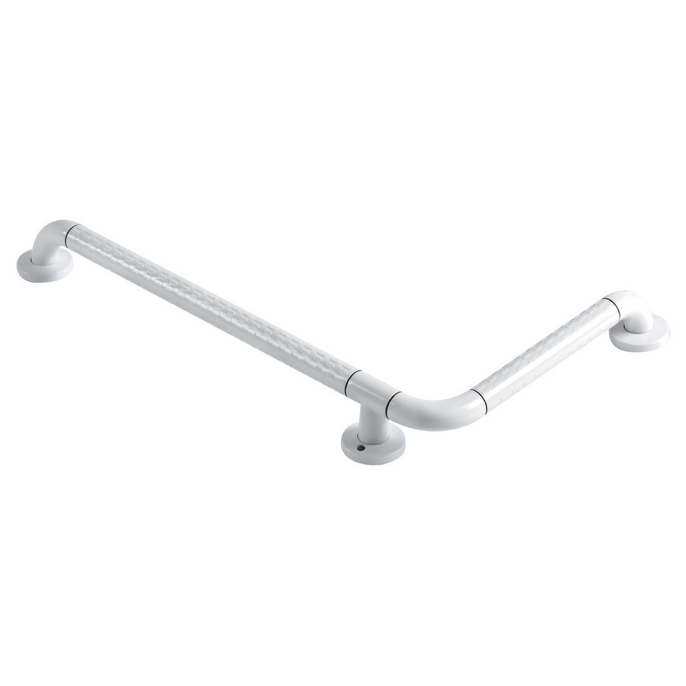 Koupelnové madlo zahnuté do pravého úhlu, vyrobeno z oceli potažené ABS plastem. Může být namontován vlevo nebo vpravo. Speciální výstupky na jeho povrchu poskytují jistější úchop. Má certifikát PZH a certifikát CE. Součástí jsou montážní díly.
