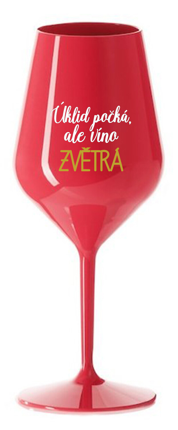 Nerozbitná červená vinná sklenice s motivem ÚKLID POČKÁ, ALE VÍNO ZVĚTRÁ je skvělá na zahradu, pláž, výlet, piknik a parádu udělá i při kempování. Jelikož je vyrobená z kvalitního polykarbonátu je de facto nerozbitná. Je to luxusní kousek, s nímž si víno můžete vychutnat prostě kdekoliv. Mají ergonomický tvar, který příjemně padne do ruky a protože je lehká, usnadňuje to její přenášení. Je snadno skladovatelná a lehce se čistí. Díky svému designu si s ní můžete vychutnat doopravdy kdekoliv bezproblémové pití výborného vína.