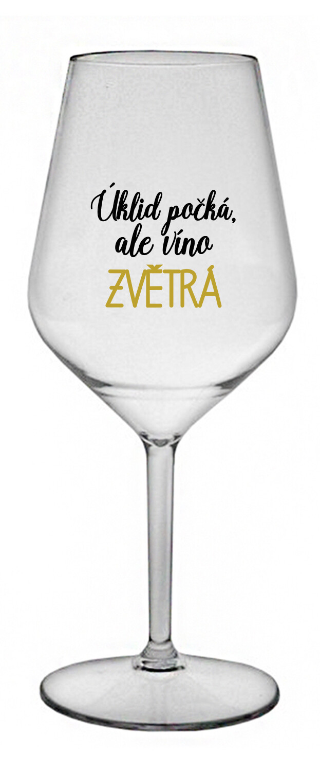 Nerozbitná čirá vinná sklenice s motivem ÚKLID POČKÁ, ALE VÍNO ZVĚTRÁ je skvělá na zahradu, pláž, výlet, piknik a parádu udělá i při kempování. Jelikož je vyrobená z kvalitního polykarbonátu je de facto nerozbitná. Je to luxusní kousek, s nímž si víno můžete vychutnat prostě kdekoliv. Mají ergonomický tvar, který příjemně padne do ruky a protože je lehká, usnadňuje to její přenášení. Je snadno skladovatelná a lehce se čistí. Díky svému designu si s ní můžete vychutnat doopravdy kdekoliv bezproblémové pití výborného vína.