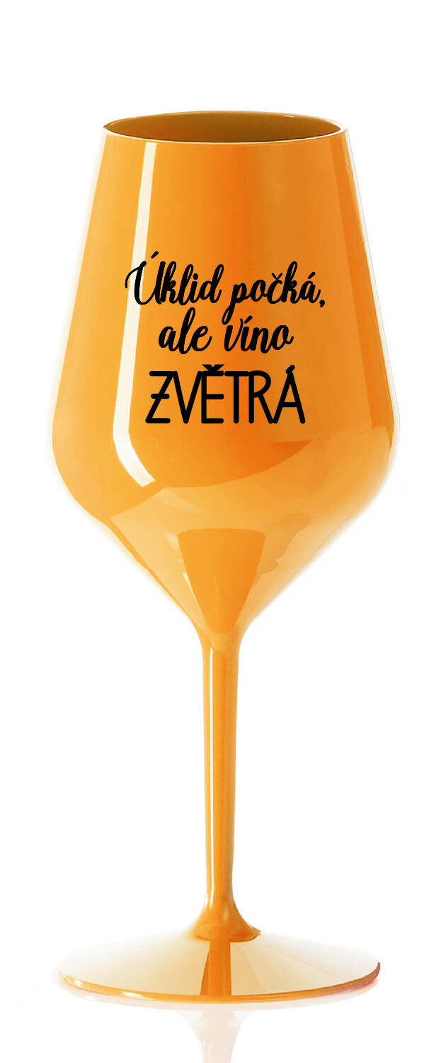 Nerozbitná oranžová vinná sklenice s motivem ÚKLID POČKÁ, ALE VÍNO ZVĚTRÁ je skvělá na zahradu, pláž, výlet, piknik a parádu udělá i při kempování. Jelikož je vyrobená z kvalitního polykarbonátu je de facto nerozbitná. Je to luxusní kousek, s nímž si víno můžete vychutnat prostě kdekoliv. Mají ergonomický tvar, který příjemně padne do ruky a protože je lehká, usnadňuje to její přenášení. Je snadno skladovatelná a lehce se čistí. Díky svému designu si s ní můžete vychutnat doopravdy kdekoliv bezproblémové pití výborného vína.