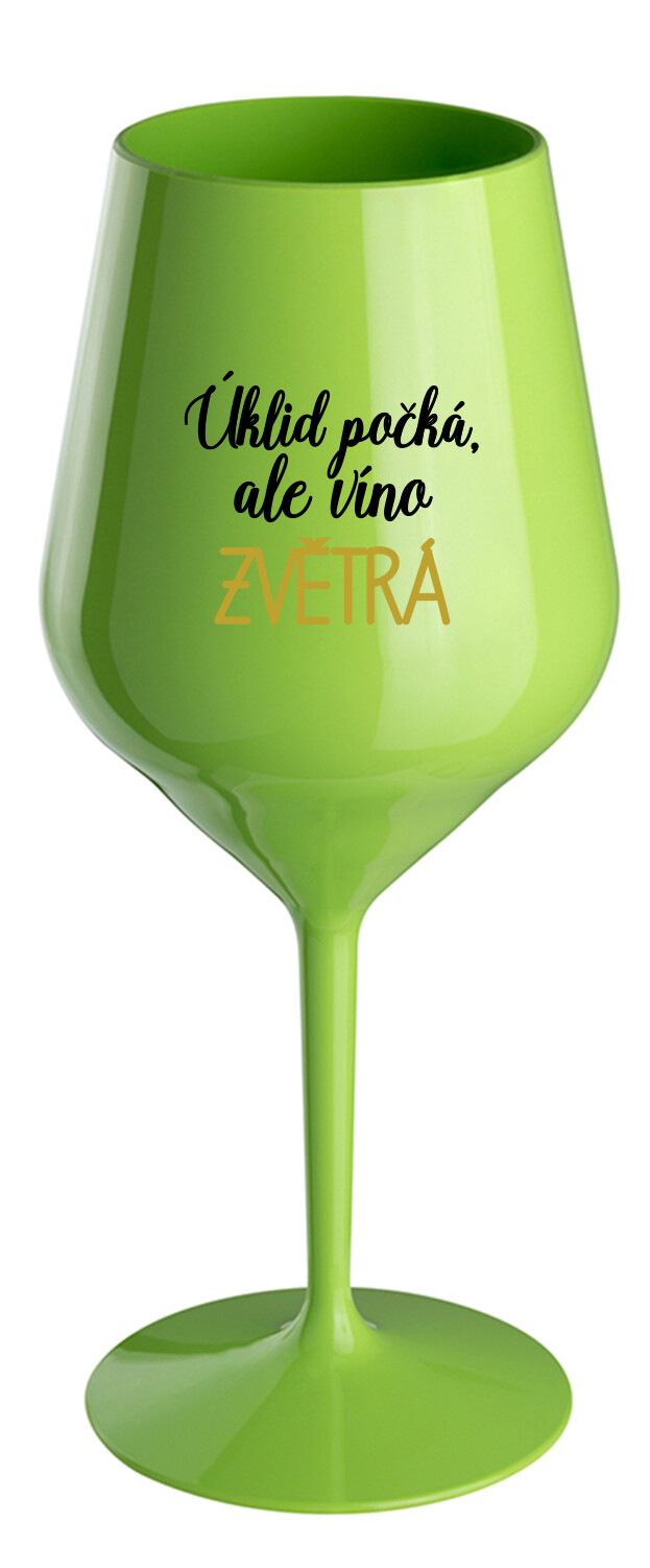 Nerozbitná zelená vinná sklenice s motivem ÚKLID POČKÁ, ALE VÍNO ZVĚTRÁ je skvělá na zahradu, pláž, výlet, piknik a parádu udělá i při kempování. Jelikož je vyrobená z kvalitního polykarbonátu je de facto nerozbitná. Je to luxusní kousek, s nímž si víno můžete vychutnat prostě kdekoliv. Mají ergonomický tvar, který příjemně padne do ruky a protože je lehká, usnadňuje to její přenášení. Je snadno skladovatelná a lehce se čistí. Díky svému designu si s ní můžete vychutnat doopravdy kdekoliv bezproblémové pití výborného vína.