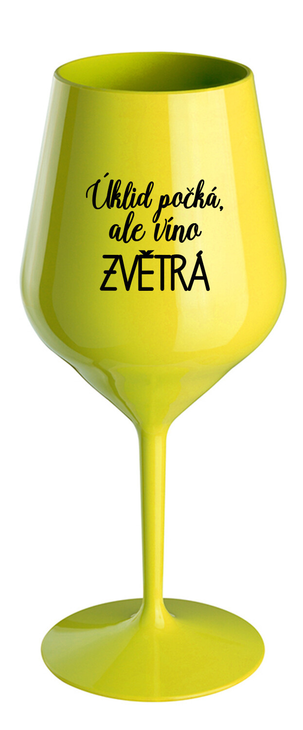 Nerozbitná žlutá vinná sklenice s motivem ÚKLID POČKÁ, ALE VÍNO ZVĚTRÁ je skvělá na zahradu, pláž, výlet, piknik a parádu udělá i při kempování. Jelikož je vyrobená z kvalitního polykarbonátu je de facto nerozbitná. Je to luxusní kousek, s nímž si víno můžete vychutnat prostě kdekoliv. Mají ergonomický tvar, který příjemně padne do ruky a protože je lehká, usnadňuje to její přenášení. Je snadno skladovatelná a lehce se čistí. Díky svému designu si s ní můžete vychutnat doopravdy kdekoliv bezproblémové pití výborného vína.