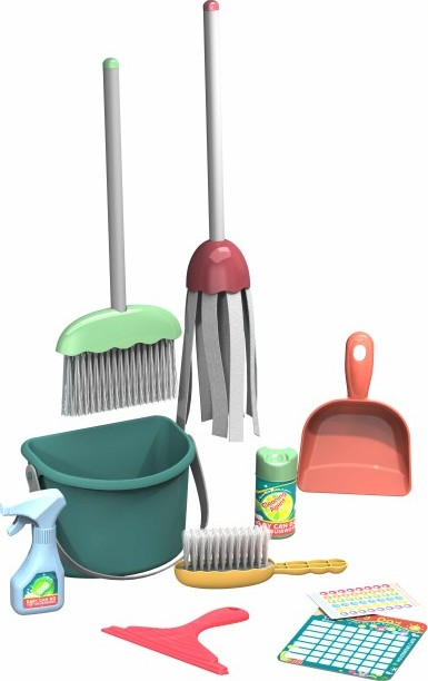 Úklidová sada obsahuje 10 komponentů- smetáček a lopatku, smeták, mop, kýbl, čistící prostředky a další. Výrobek je vhodný pro děti od 3 let.